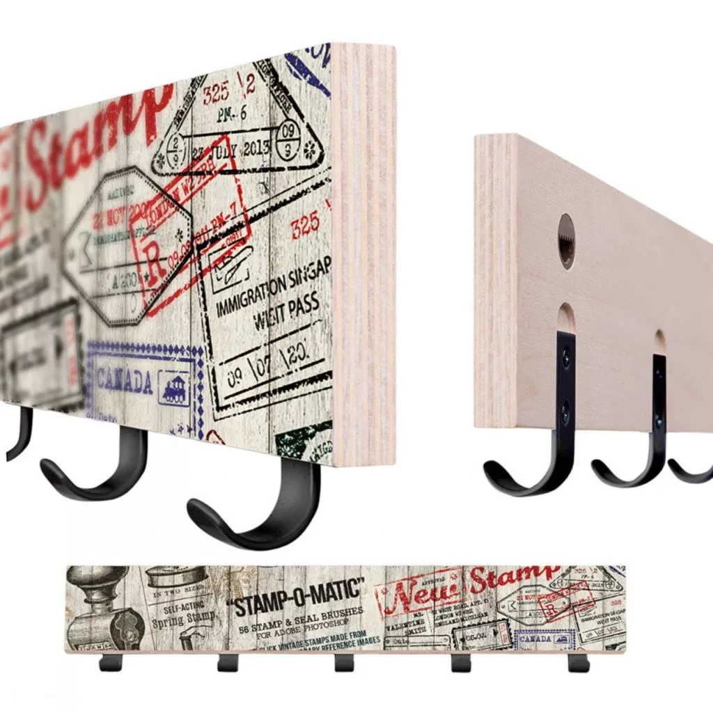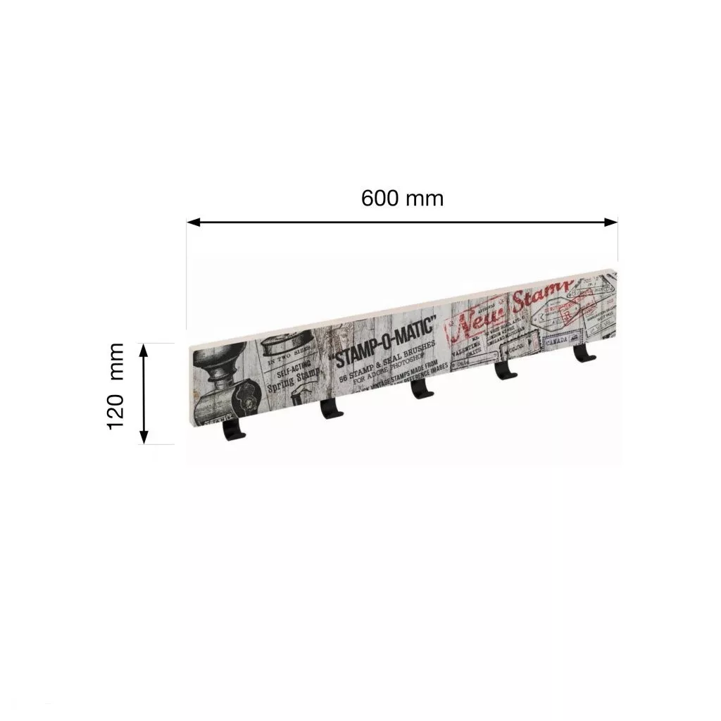 Színes postai motívummal (bélyegek, bélyegzők) és öt fekete akasztóval ellátott kabáttartó állvány, 600 mm széles, 120 mm magas és 31 mm mély.