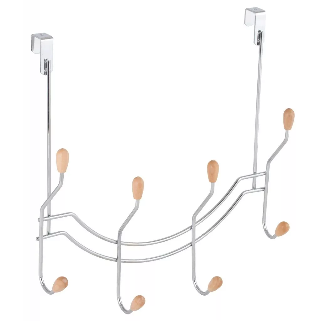 Krómozott ajtóakasztó 4 kampóval, felső és alsó felfüggesztéssel, szélessége 360 ​​mm, magassága 375 mm és mélysége 100 mm. A kampók vége felül és alul fa. Akasztó szélessége 20 mm.