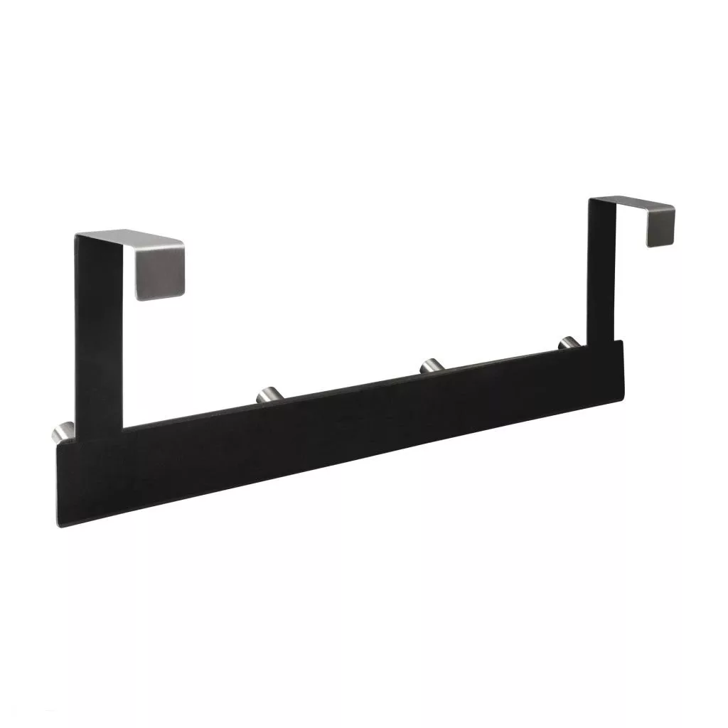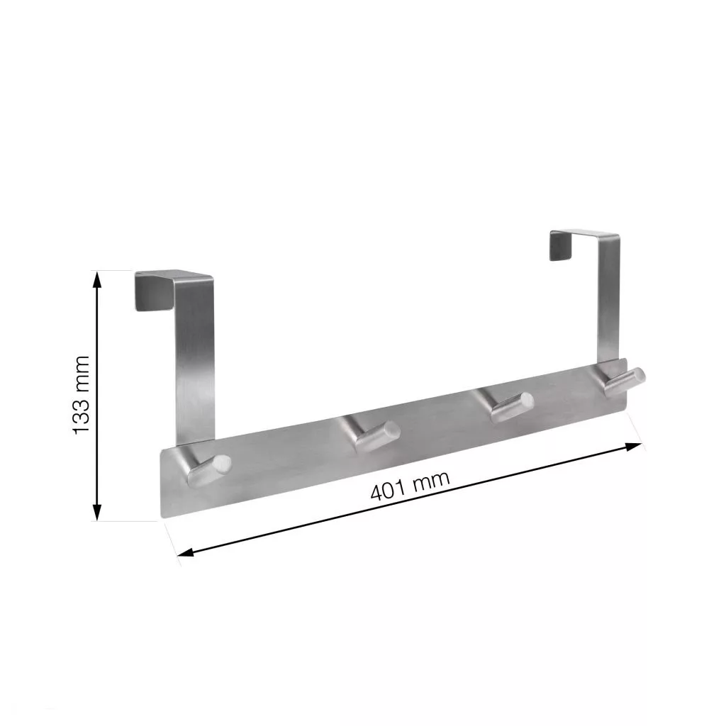 Ajtón átvezető kabáttartó állvány 4 akasztóval, szálcsiszolt szatén nikkel kivitelben, 401 mm széles, 133 mm magas és 75 mm mély. Akasztómélység 40 mm.