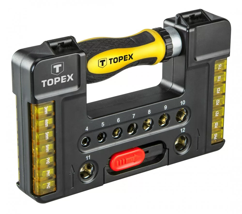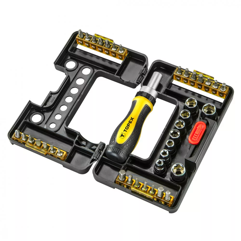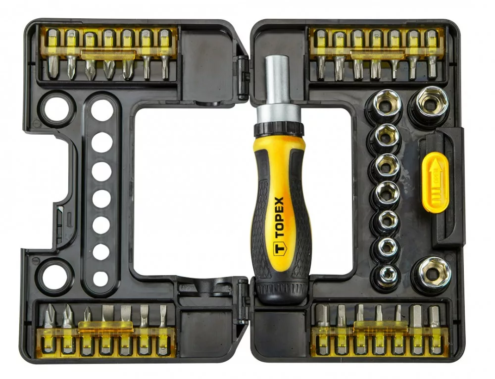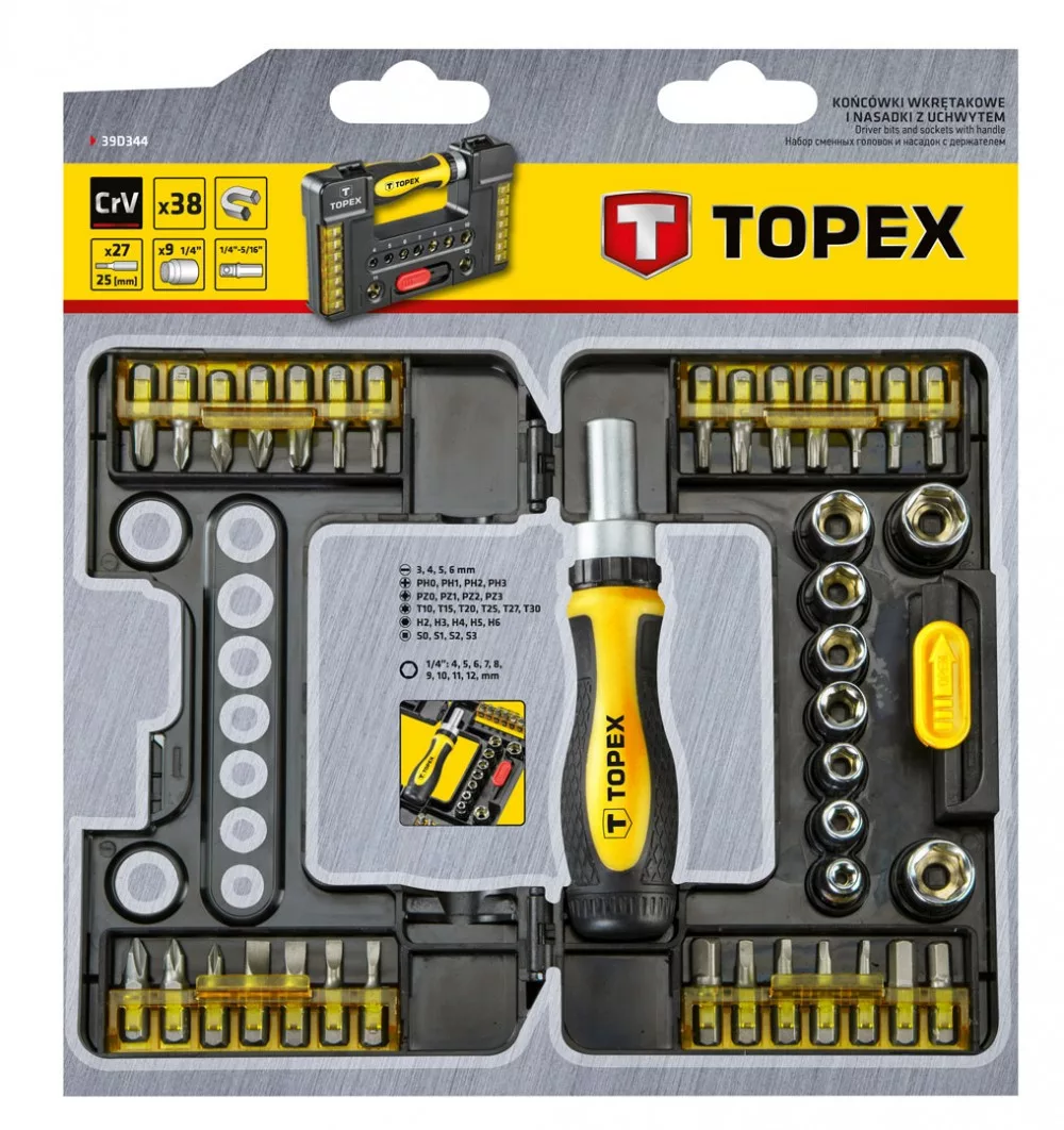 TOPEX Csavarbehajtó bitek és dugókulcsok hajtókarral (ref. sz. 39D3441), 38 db-os készlet, műanyag csomagolásban elrendezve. Minden eleme a termék hosszú élettartamát biztosító, kimagasló minőségű króm-vanádium ötvözetből készül. A készletben dugókulcsok, csavarbehajtó bitek, racsnis hajtókar és a munkavégzés komfortját biztosító, csúszásgátló bevonatú, ergonomikusan elkészített műanyag nyél. A készlet sokoldalúan használható kisebb háztartási, jármű szerelési, gép szerelési munkák, a ház körüli és a garázsban végezhető ezermester munkák során.