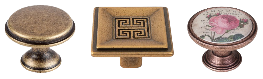 A porcelán szintén fontos szerepet játszik a rusztikus típusú gombokban. A sárgaréz patina vagy bronz felületkezelés porcelánnal kombinálva lenyűgözően mutat mind a régi fiókos szekrényeken és szekrényeken, mind a modern bútorokon. A porcelán gombok és a fogantyúk azonos stílusú kombinációi népszerűek, bájos vizuális kapcsolatot teremtve.