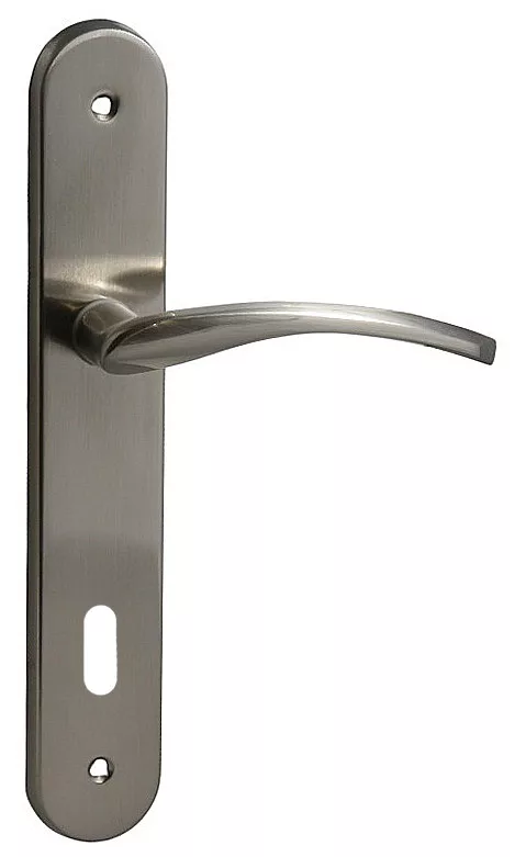 Nagyon impozáns megjelenésű szépen ívelt kilincs. Szálra csiszolt matt króm felülettel. Rugós működtetésű termék. Szállítás: 2 munkanap Ajtócímke méret: 243 mm x 42 mm Kilincsméret: 120 mm