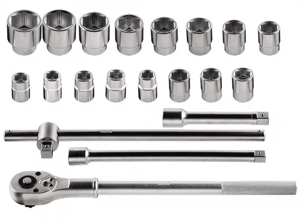 Dugókulcs klt., 3/4, 2. sz. készlet, racsnis hajtókar 500 mm, 24-fogas, forgásirány-váltó, T-hajtókar 460 mm, 3 db hosszabbító 100 mm, 200 mm és 400 mm, 16 db hatlapú dugókulcs, méretek: 19 mm, 21 mm, 22 mm, 23 mm, 24 mm, 26 mm, 27 mm, 29 mm, 30 mm, 32 mm, 35 mm, 36 mm, 38 mm, 41 mm, 46 mm, 50 mm, CrV acél, fém hordtáska