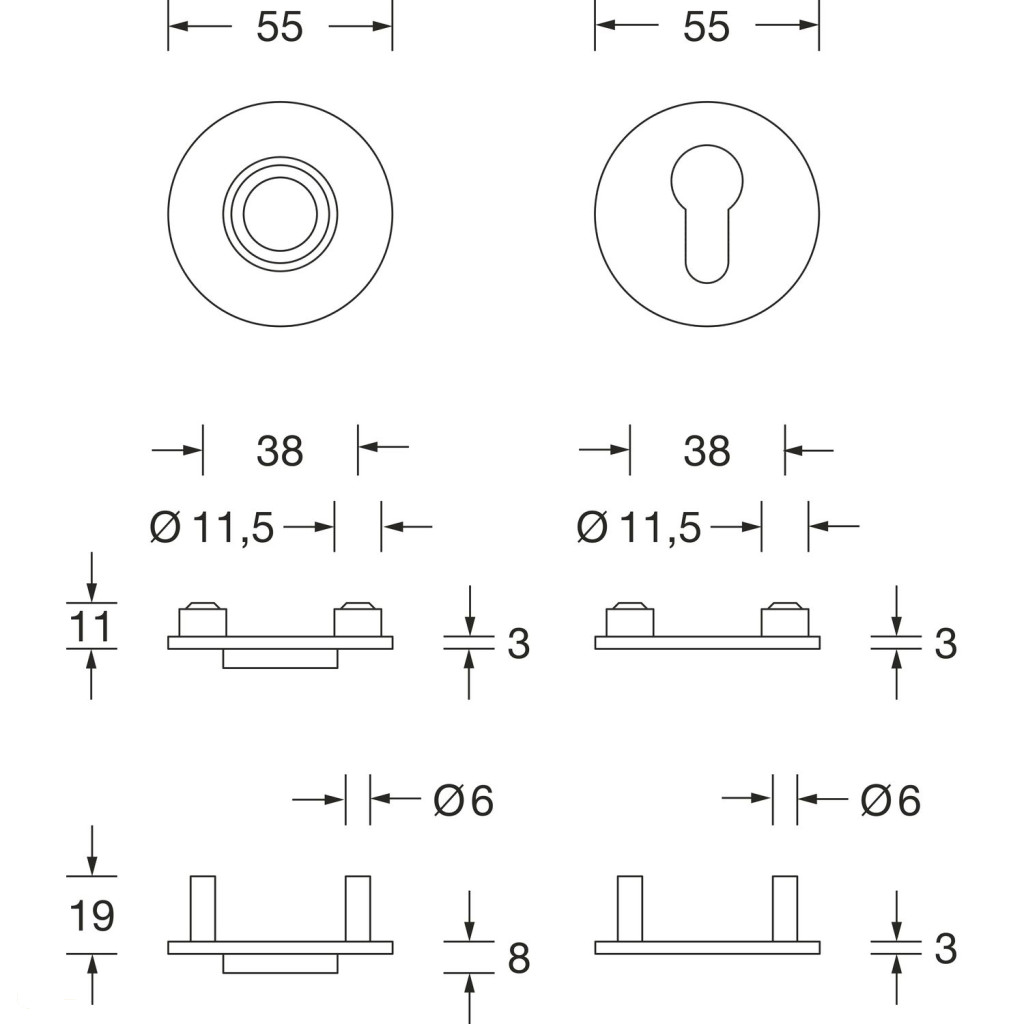 Műszaki követelmények: Az ajtó vastagságának 38–52 mm között kell lennie. Kérjük, vegye figyelembe a zárfészek pozícióját. Fúrja ki a kilincs és a kulcsrozetta furatát: 12 mm átmérőjű és 12 mm mély. A rozettákhoz való ajtólap kimarásához használja a 102247796 marósablont. A mart terület és a zárfelület közötti maradék falvastagságnak elegendőnek kell lennie ahhoz, hogy a zárra ne gyakoroljon nyomást a csavarozás biztonságosan elvégezhető legyen. Nem kapható tűzálló változatban. A rozettpárok levehetők – CSAK az FSB ASL zárbetétekkel kompatibilis. Műszaki követelmények: Az ajtó vastagságának 38–52 mm között kell lennie. Kérjük, vegye figyelembe a zárfészek pozícióját. Fúrja ki a kilincs és a kulcsrozetta furatát: 12 mm átmérőjű és 12 mm mély. A rozettákhoz való ajtólap kimarásához használja a 102247796 marósablont. A mart terület és a zárfelület közötti maradék falvastagságnak elegendőnek kell lennie ahhoz, hogy a zárra ne gyakoroljon nyomást a csavarozás biztonságosan elvégezhető legyen. Nem kapható tűzálló változatban. A rozettpárok levehetők – CSAK az FSB ASL zárbetétekkel kompatibilis.