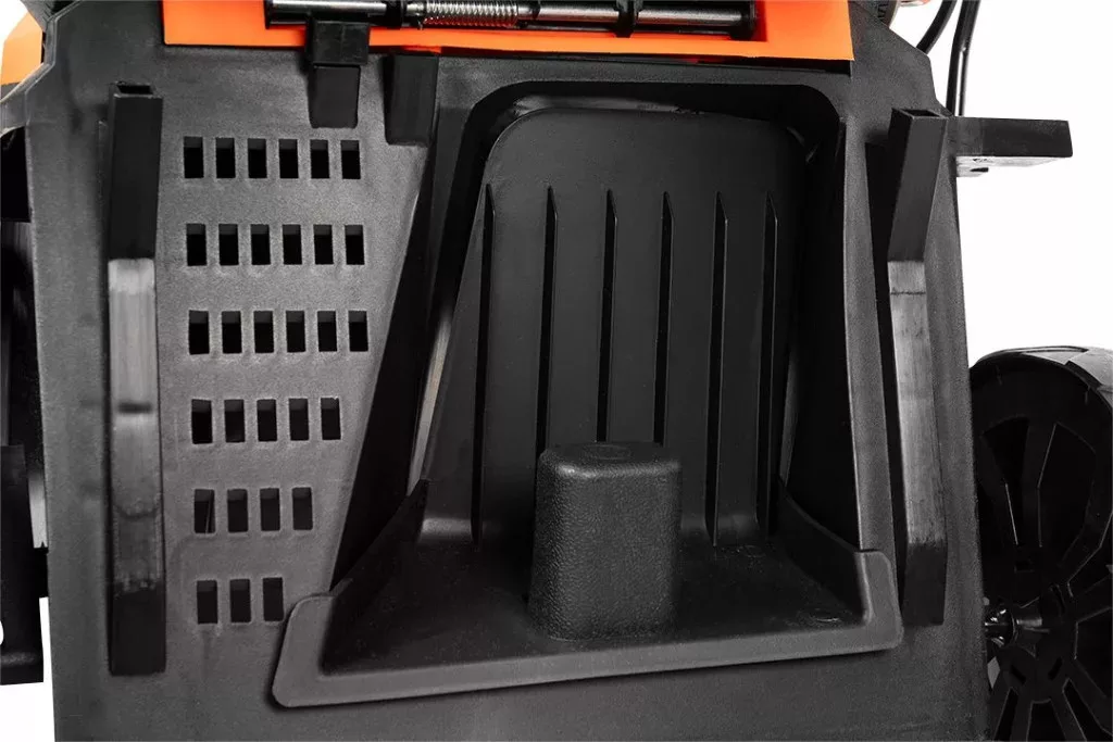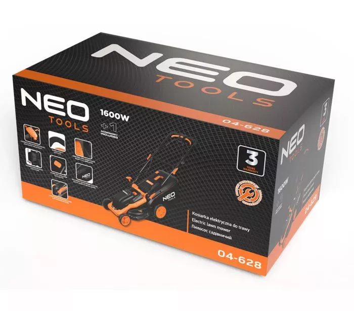 Elektromos fűnyíró 1600W, 38 cm, 45 L – NEO TOOLS 1600 W teljesítményű, szíjhajtásos elektromos fűnyíró 38 cm vágásszélességgel. A 6 fokozatú, központi magasságállítás (25–75 mm) lehetővé teszi a pontos vágást különböző gyepviszonyok mellett. Alkalmas fűgyűjtésre, mulcsozásra vagy hátsó kidobásra. A 45 literes, telítettségjelzővel ellátott gyűjtőkosár, valamint a nagy méretű kerekek kényelmes használatot biztosítanak. Összecsukható fogantyúval és szállítófüllel rendelkezik. Műszaki adatok: Teljesítmény: 1600 W Vágásszélesség: 380 mm Vágási magasság: 25 / 35 / 45 / 55 / 65 / 75 mm Magasságállítás: központi, 6 fokozat Gyűjtőkosár: 45 L, telítettségjelzővel Fordulatszám: max. 3200 rpm Kerekek: 150 mm (elöl), 200 mm (hátul) Funkciók: gyűjtés / mulcsozás / hátsó kidobás Tápellátás: 230 V ~ 50 Hz Zajszint (LWA): 93,7 dB Védettség: IPX4