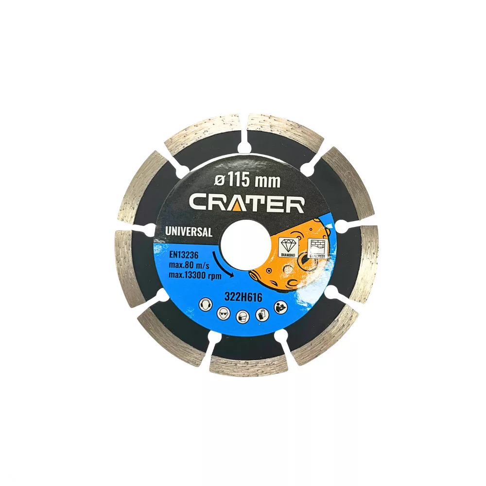 GYÉMÁNT VÁGÓTÁRCSA 115 MM, SZEGMENSES CRATER A Crater 115 mm-es szegmenses gyémánt vágótárcsa megbízható, nagy teljesítményű eszköz száraz vágáshoz, amely kiválóan alkalmazható beton, tégla, térkő, kő és más építőanyagok darabolására. A szegmenses kialakítás hatékony hűtést és gyors vágást biztosít, így ideális választás barkácsolók és szakemberek számára egyaránt. Átmérő: 115 mm Kompatibilis a legtöbb sarokcsiszolóval. Szegmenses kivitel Javított hűtés és jobb porelszívás, így hosszabb élettartamot és gyorsabb vágást biztosít. Gyémántszemcsés él Precíz, tiszta vágások még kemény anyagokban is. Száraz vágásra tervezve Ideális kültéri és beltéri munkákhoz is, víz nélkül használható. Tartós és megbízható A Crater minőség garantálja a hosszú élettartamot és a biztonságos használatot. Műszaki adatok: Átmérő: 115 mm Típus: Szegmenses Használat: Száraz vágás Alkalmazás: Beton, tégla, térkő, természetes kő stb. Márka: Crater A Crater 115 mm-es gyémánt vágótárcsa a tökéletes választás minden olyan feladathoz, ahol gyors, pontos és megbízható vágásra van szükség. Crater Kiváló minőségű professzionális szerszámok