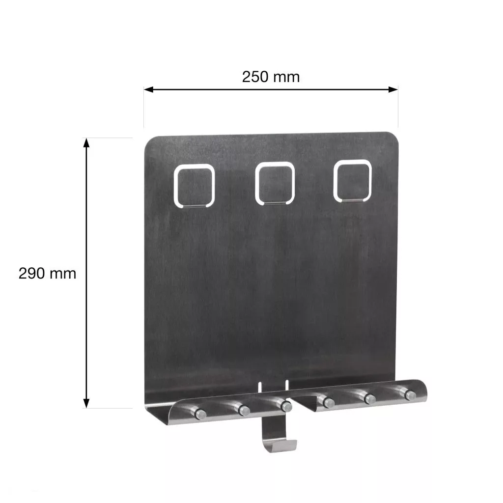 Univerzális kulcstartó szálcsiszolt nikkel kivitelben, szélessége 250 mm, magassága 290 mm és mélysége 85 mm. A falhoz rögzítéshez szükséges távolság 197 mm. A csomag tartalmazza a rögzítőelemeket és a mágneseket.