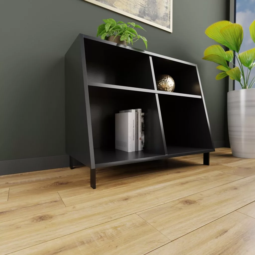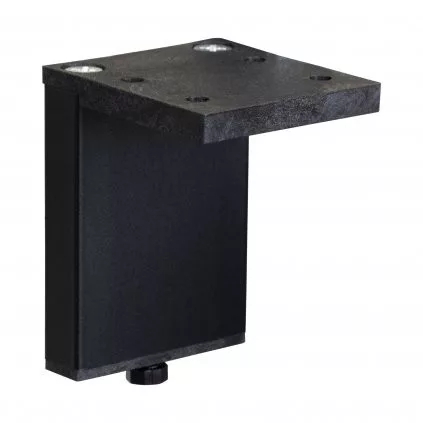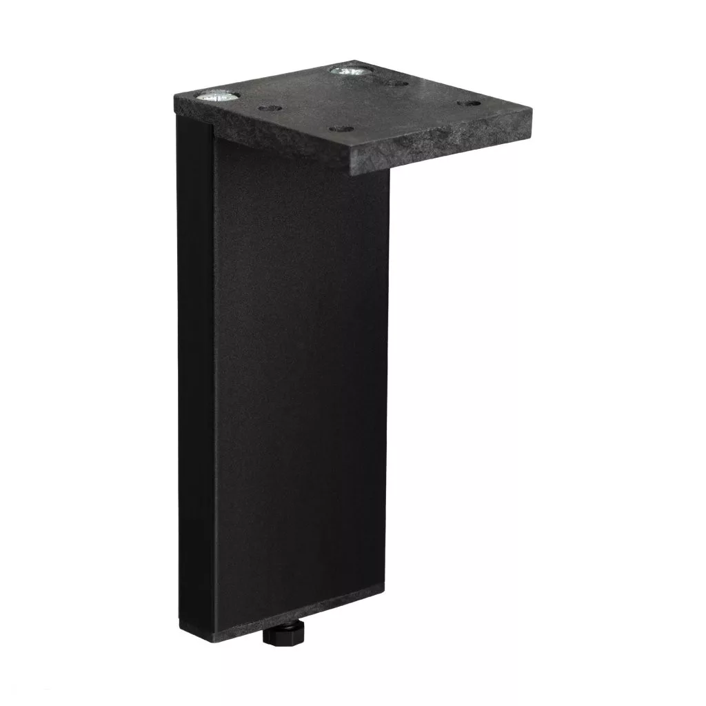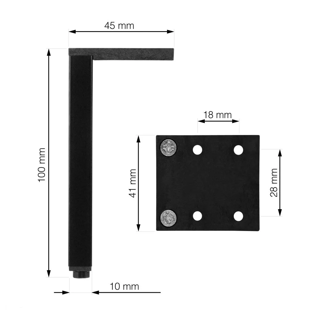 Minimalista bútorláb szálcsiszolt eloxált fekete kivitelben, 10/45 mm szélességgel, 100 mm magassággal és 41 mm mélységgel, műanyag csúszkával. A 45 x 41 mm méretű talp biztosítja a bútor szilárd rögzítését.