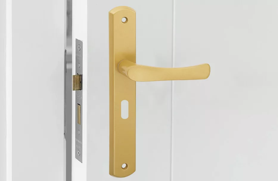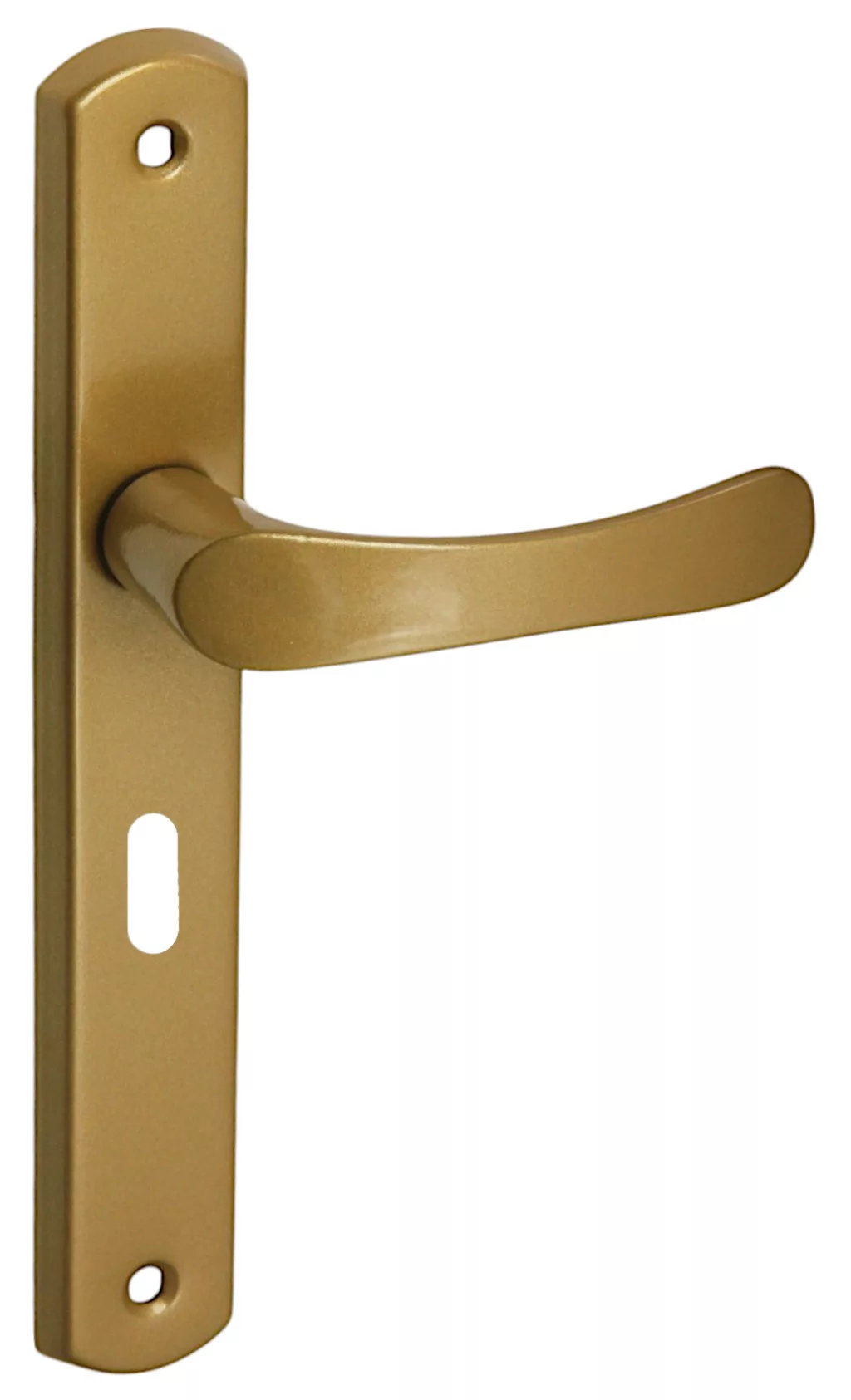 Larina egyszerű, letisztult vonalvezetésű népszerű arany ajtókilincsünk keskeny pajzsú kivitelben.