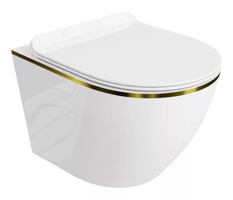 Modern fehér WC-csésze arany dekorcsíkkal – Letisztult forma elegáns arany részlettel. Luxus megjelenés, tökéletes választás stílusos fürdőszobákba.