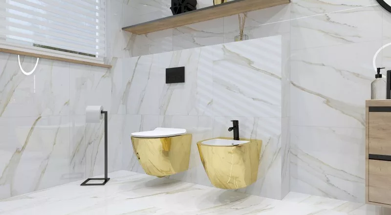 A Lavita SOFI SLIM GOLD/WHITE modern WC-csésze elegáns arany-fehér kombinációban, karcsú formával és perem nélküli kialakítással. Luxus megjelenés és könnyű tisztíthatóság egyben.
