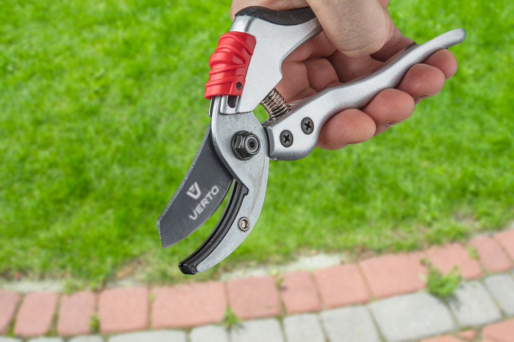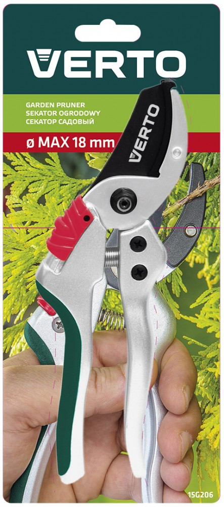 VERTO Vágóüllős alumínium kerti metszőolló ( hossza 195 mm és a vágási átmérő max. 18 mm. Ágak és cserjék metszésére használható. Az élek ergonomikus 15°-os görbülete jelentősen megkönnyíti a munkavégzést és növeli a munka komfortját. Az élt teflon bevonat borítja, védve a korróziótól. Az alumíniumból készült ház garantálja a szerszám hosszú élettartamát. Az élek blokádja megakadályozza a véletlenszerű kinyitást. A műanyagból készült ergonomikus fogantyú csúszásgátlóval van ellátva, ami biztosítja a munkavégzés biztonságát és komfortját. Mellévágó