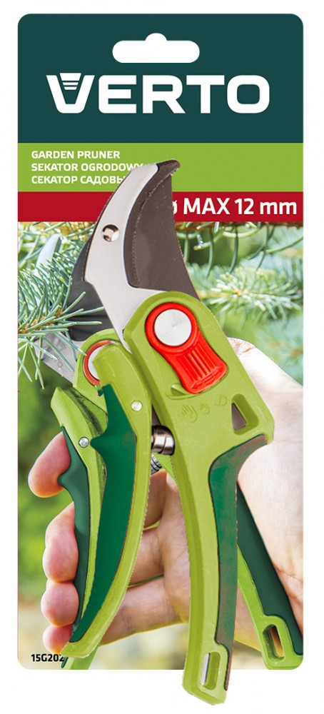 VERTO Vágóüllős kerti metszőolló ( vágási átmérő max. 12 mm. Ágak és cserjék metszésére használható. Az élt teflon bevonat borítja, védve a korróziótól. Az élek blokádja megakadályozza a véletlenszerű kinyitást. A műanyagból készült ergonomikus fogantyú csúszásgátlóval van ellátva, ami biztosítja a munkavégzés biztonságát és komfortját. A szabályozható fogantyú révén jól illik a női kezekbe is. Rávágó