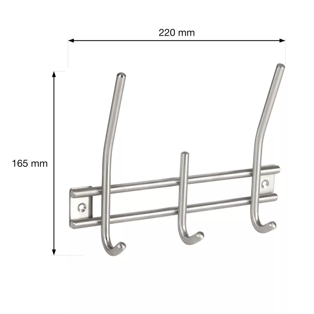 Rozsdamentes acél kabáttartó állvány három akasztóval, 220 mm széles, 165 mm magas és 50 mm mély. Rögzítőcsavarokkal együtt.