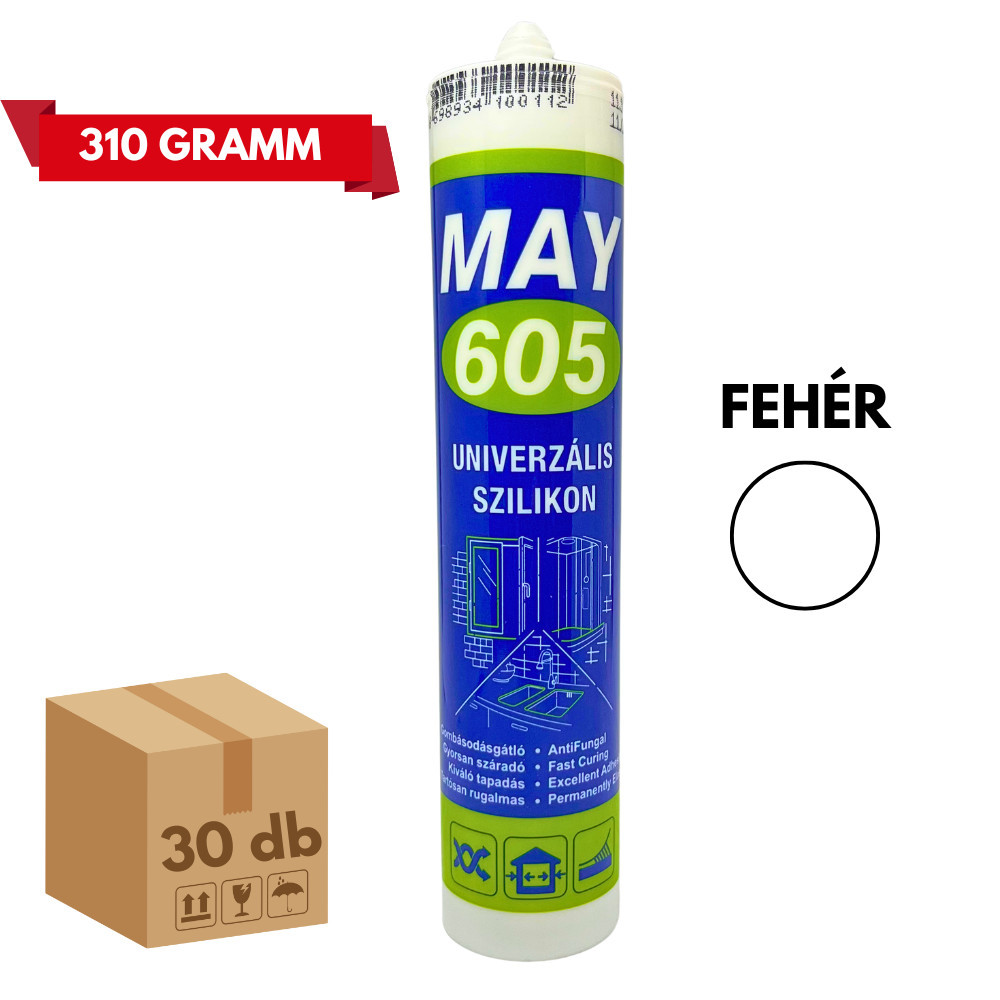 A MAY 605 univerzális szilikon egy savval keményedő, egykomponensű szilikon tömítőanyag általános tömítési és üvegezési alkalmazásokhoz. Erős tapadást biztosít, és alkalmas általános, nem porózus építőanyagokra. Kikeményedés után tartósan rugalmas marad. Acetoxi térhálósító rendszer. Penészmentes. Kiváló tapadás nem porózus felületeken. Ellenáll az öregedésnek, repedésnek és elszíneződésnek. Ellenáll számos vegyszernek, tisztítószernek és mosószernek. Bármilyen évszakban alkalmazható. Tipikus ecetszag a kikeményedés során. Alkalmazási területek Általános tömítési és üvegezési alkalmazások Nyílászárók körüli tömítések szigeteléshez és hézagkitöltéshez. Tömítés barkács alkalmazásoknál Fürdőszoba, konyha és vízvezeték alkalmazásokhoz. Csatlakozó és tágulási hézagok üvegen, porcelánon, acélon stb. Elektromos, telefon stb. aljzatok és kapcsolók tömítése.