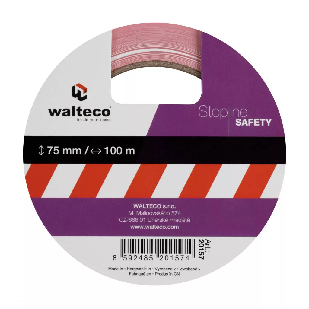 Tartós, piros-fehér figyelmeztető szalag, 75 mm széles és 100 m hosszú. A szalag jellegzetes színben nyomtatott, nagy szakítószilárdságú, kötéskor nem szakad el.