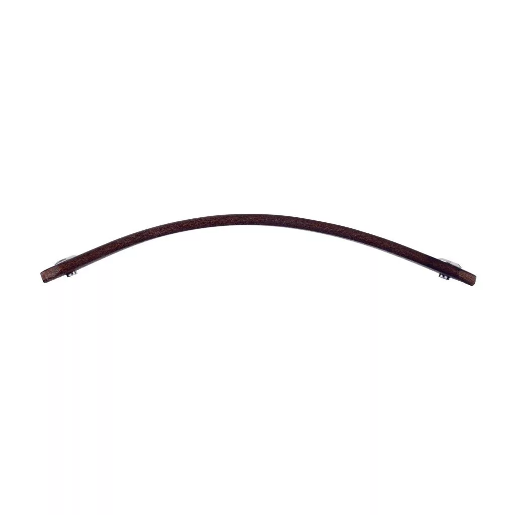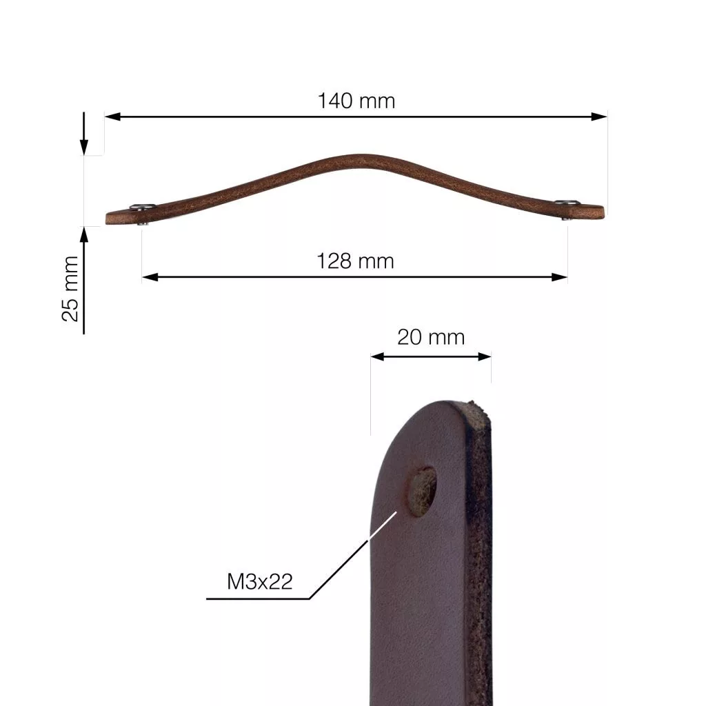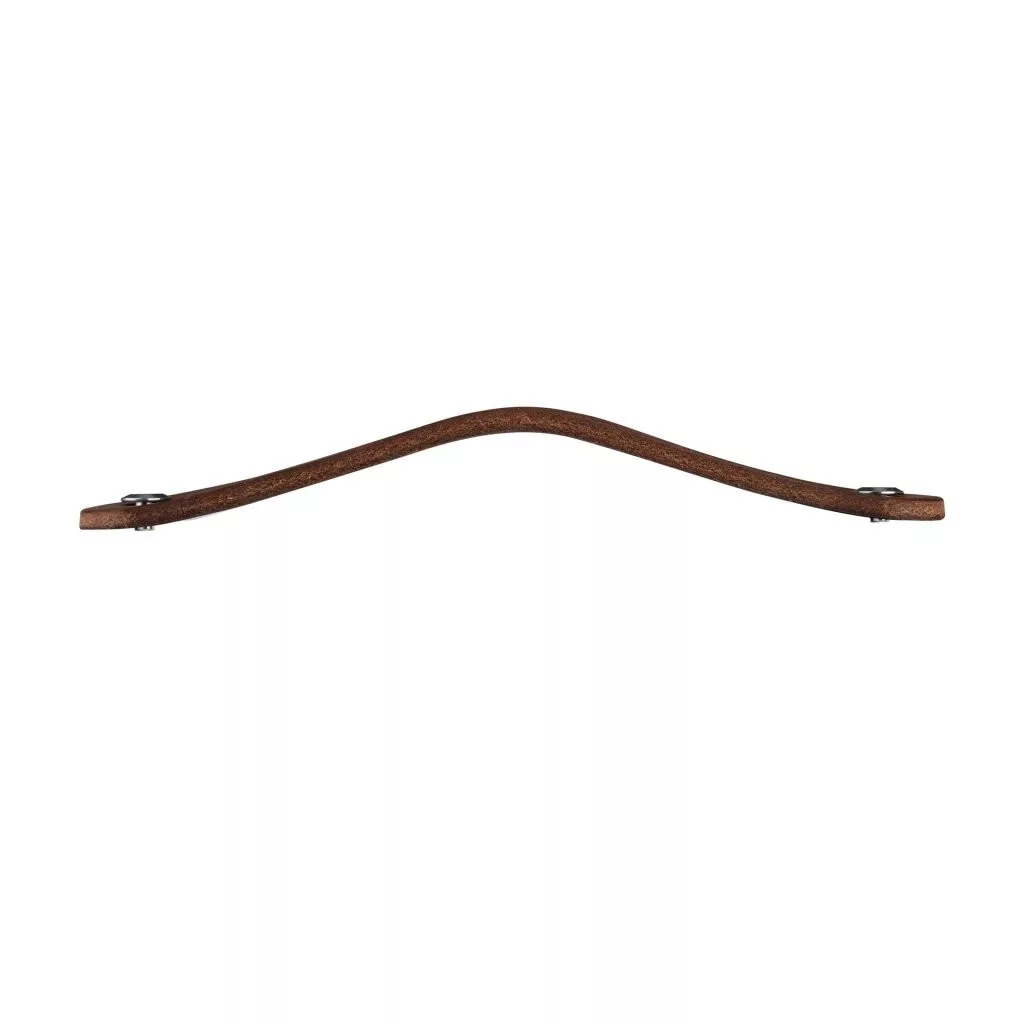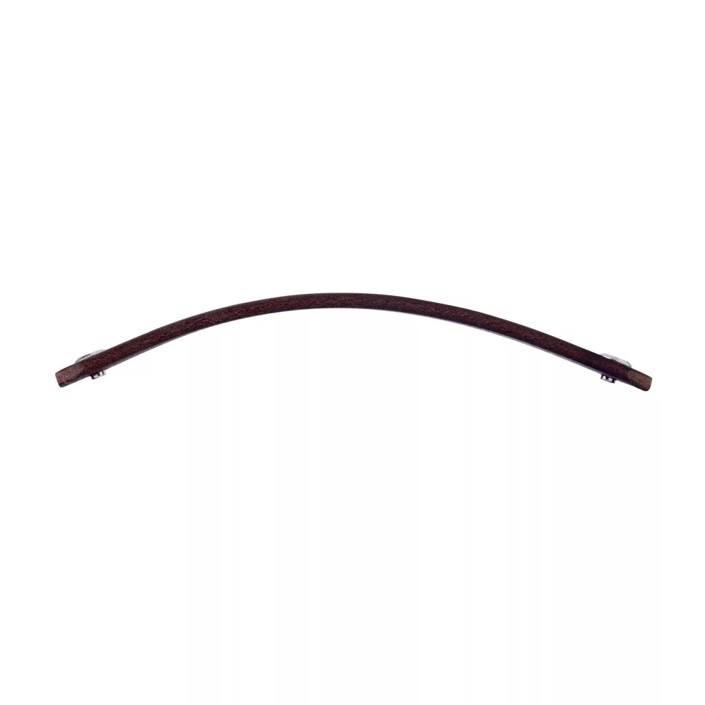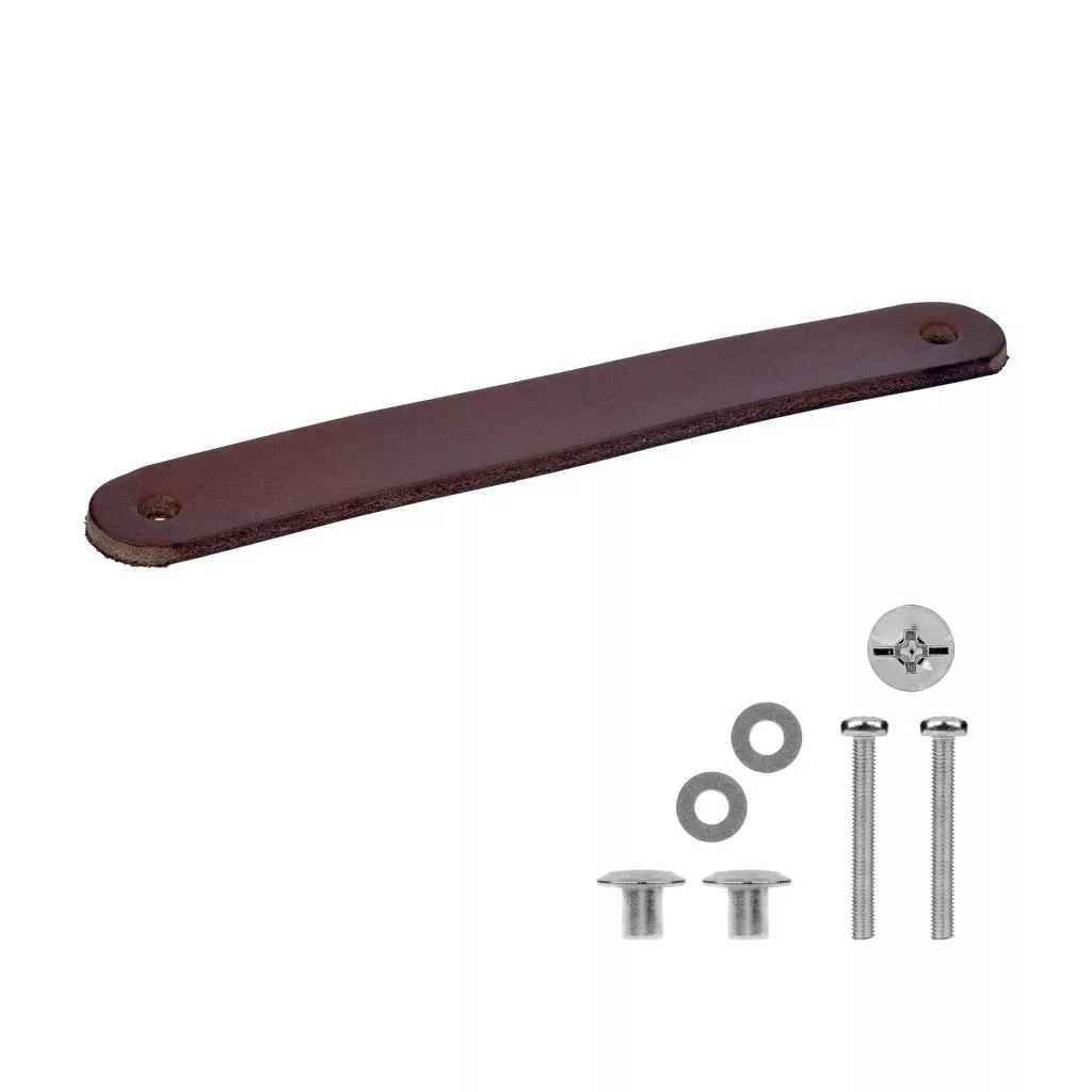 Modern Tolga bútorfogantyú sötétbarna bőrből, 128 mm-es tengelytávolsággal. A fogantyú hossza 140 mm, magassága 25 mm. Rögzítőcsavarral együtt.