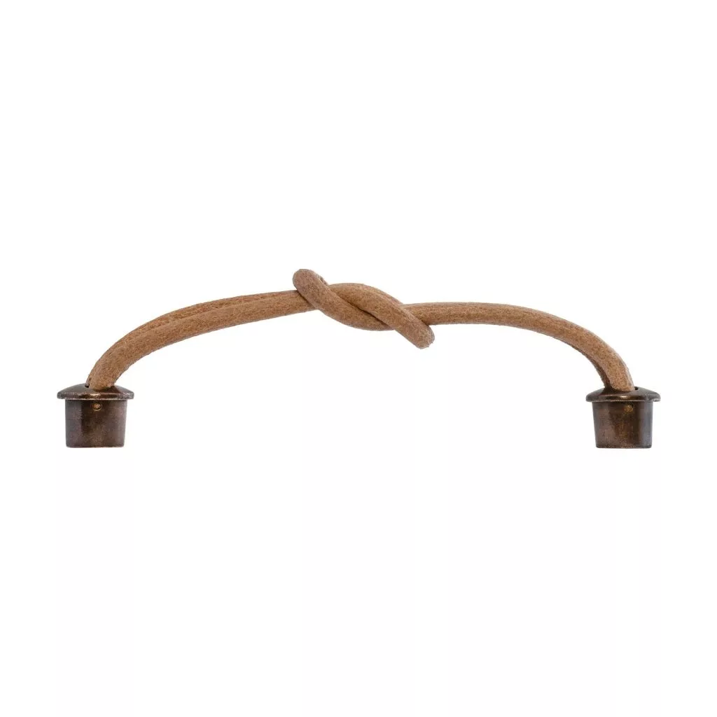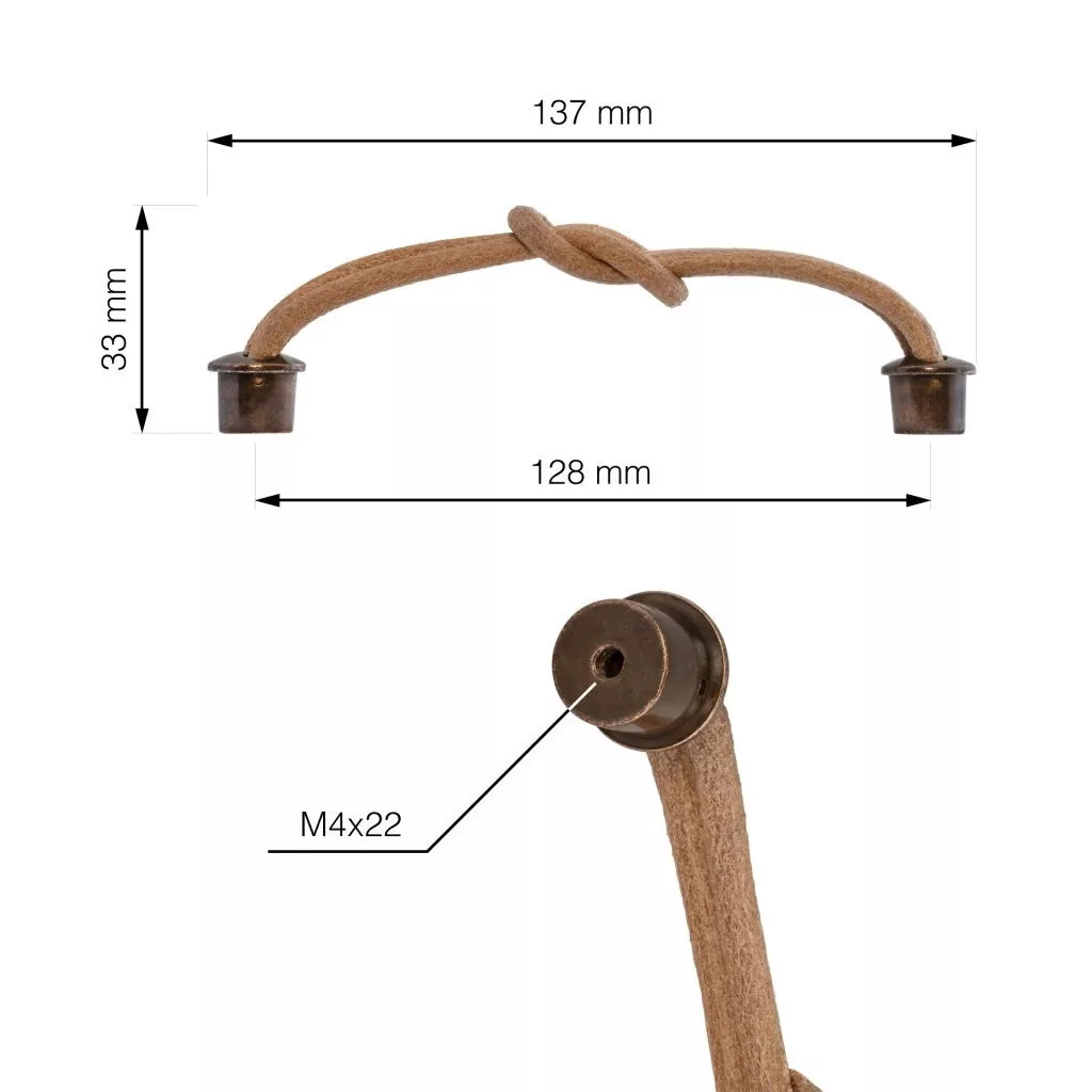 Modern bútorfogantyú Rimikni, 128 mm-es tengelytávolsággal, bőr/antik réz kivitelben. A fogantyú hossza 137 mm, magassága 33 mm. Rögzítőcsavarral együtt.