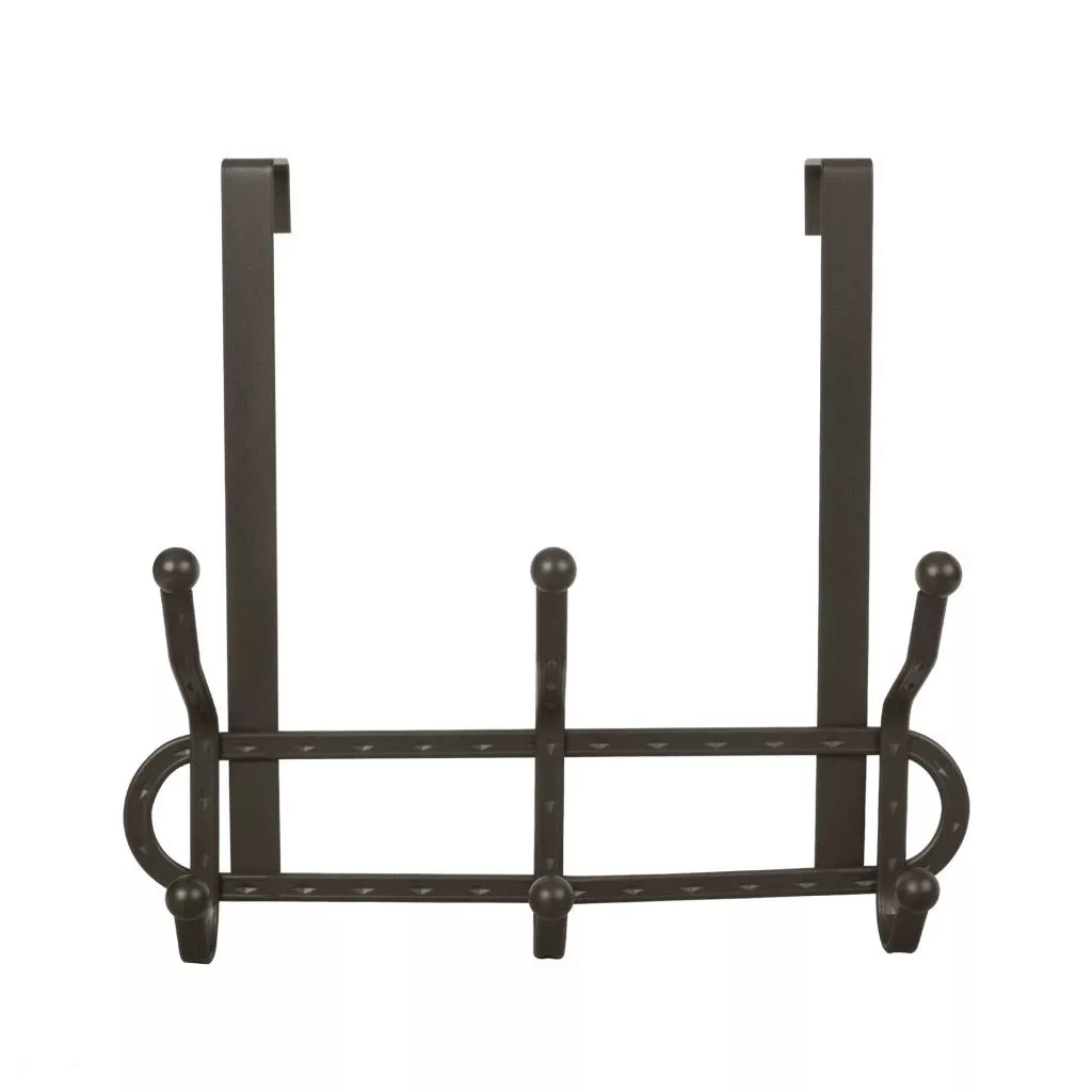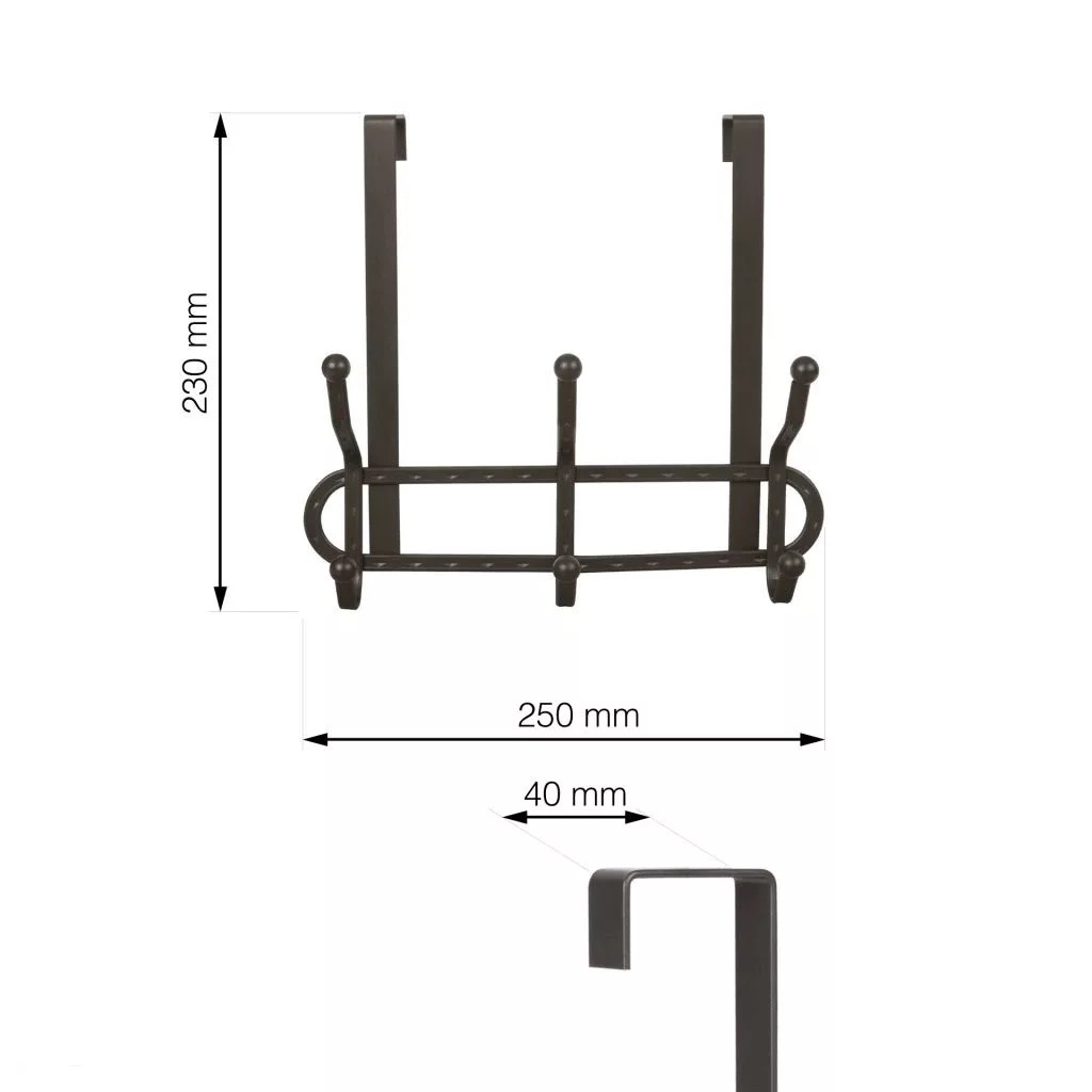 Ajtóakasztó 3 kampóval, felső és alsó akasztással, barna antik dizájnban, 250 mm szélességgel, 230 mm magassággal és 105 mm teljes mélységgel. Az akasztó akasztási mélysége 40 mm.