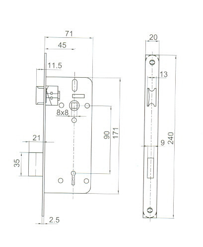 BEVÉSŐZÁR BIZ.7CM-ES 2K.AZON./23R KEREK ANBO 410 Azonos zárlatú (mindegyik a 23-as számú kulccsal működtethető) Kerek előlap Előlap-kilincsközép távolság: 45mm Kilincs-kulcsközép távolság: 90mm Kilincstengely 8x8mm Előlap és zárólemez anyaga: acél Zártest felületkezelés: horganyzott Kilincsnyelv : zamak öntvény Alsó retesz : zamak öntvény 2 db zamak kulcs, 8 különböző forma Felső nyelv váltós, a kulccsal működtethető Alsó retesz kettős záródással Nyelv fordítható
