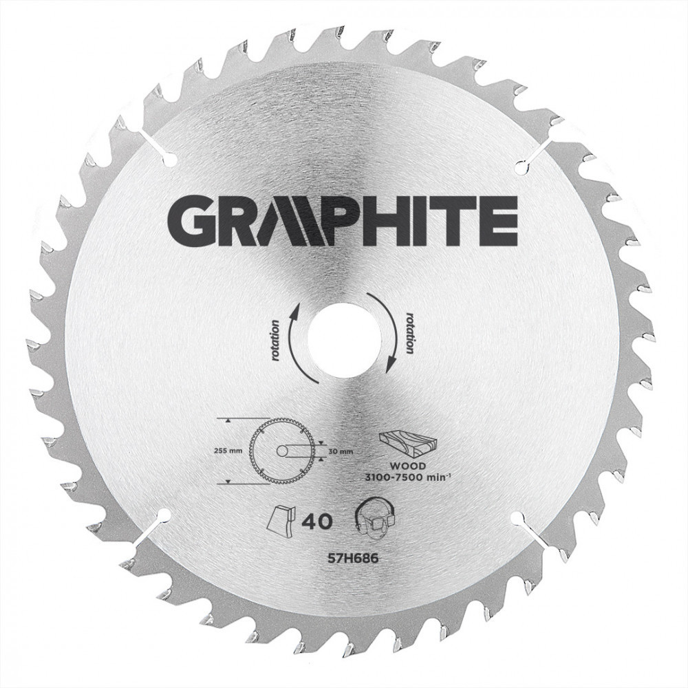 A GRAPHITE vídiabetétes fűrésztárcsa a hőmérsékletnek és a deformálódásnak igen ellenálló MN65-ös mangán acélötvözetből készül. Az YG6A vídiabetétes fogazás lehetővé teszi a fa és faalapú anyagok, mint pl. a rétegelt lemez, a forgácslap vagy az MDF lapok nagyoló vágását. A csomagolásban megtalálható szűkítő gyűrűk lehetővé teszik a fűrésztárcsák alkalmazását a fűrészgép típusok többségéhez.