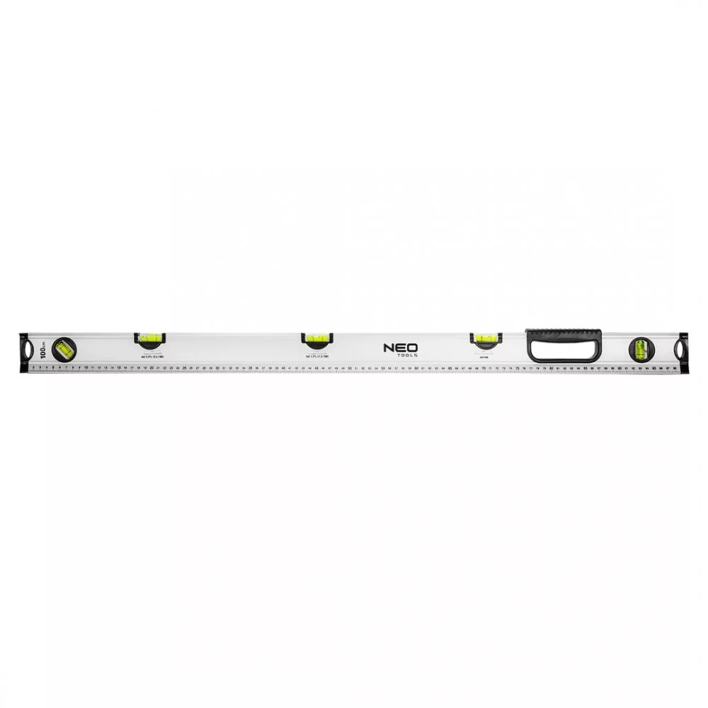 Speciális vízmérték 100 cm, 5 fiola, különböző szögek a NEO márkától a szakemberek számára, akár 5 fiolával. Lehetővé teszi a következő szögek mérését: 0°, 1,5°, 3,5°, 45°, 90°. A vízmérték 100 cm hosszú, 3 cm széles és 6 cm magas. A pontossága ±0,5 mm/m. A kényelmes fogantyú és a szerszám két oldalán található metrikus skála megkönnyíti a munkát. Ajánlott többek között a csatornavezetékek vagy járdakövek meredekségének mérésére.