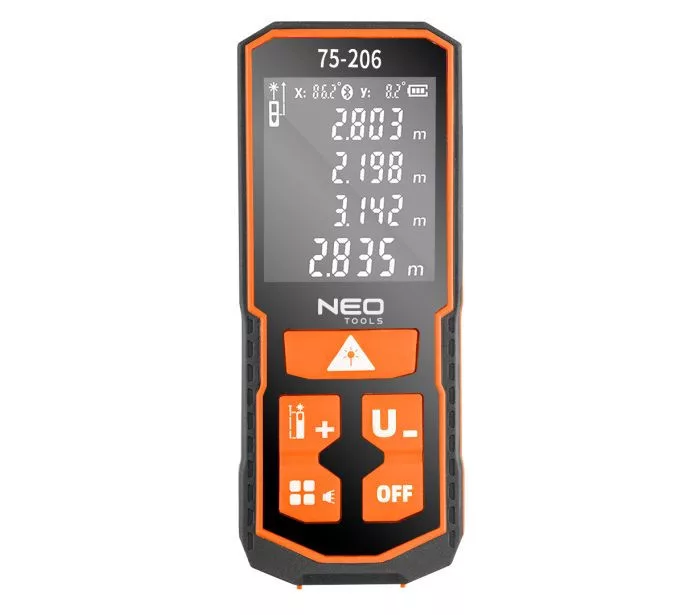 Lézeres távolságmérő, IP54, tartomány: 0,05 - 100 m, lézer hullámhossza 635 nm, tápegység 2xAA NI-MH újratölthető elem vagy 2db AA elem, memória az utolsó 30 mérésről, II osztály, mértékegységek: m/in/ft, mérési távolság, terület, hangerő, folyamatos mérés, Pythagoras, összeadás és kivonás, maximum és minimum mérés, mérési lehetőség a készülék elejétől, közepétől és végétől, elektronikus szögmérő, állítható hangerő, USB Type-C töltőkábellel és csuklópánttal