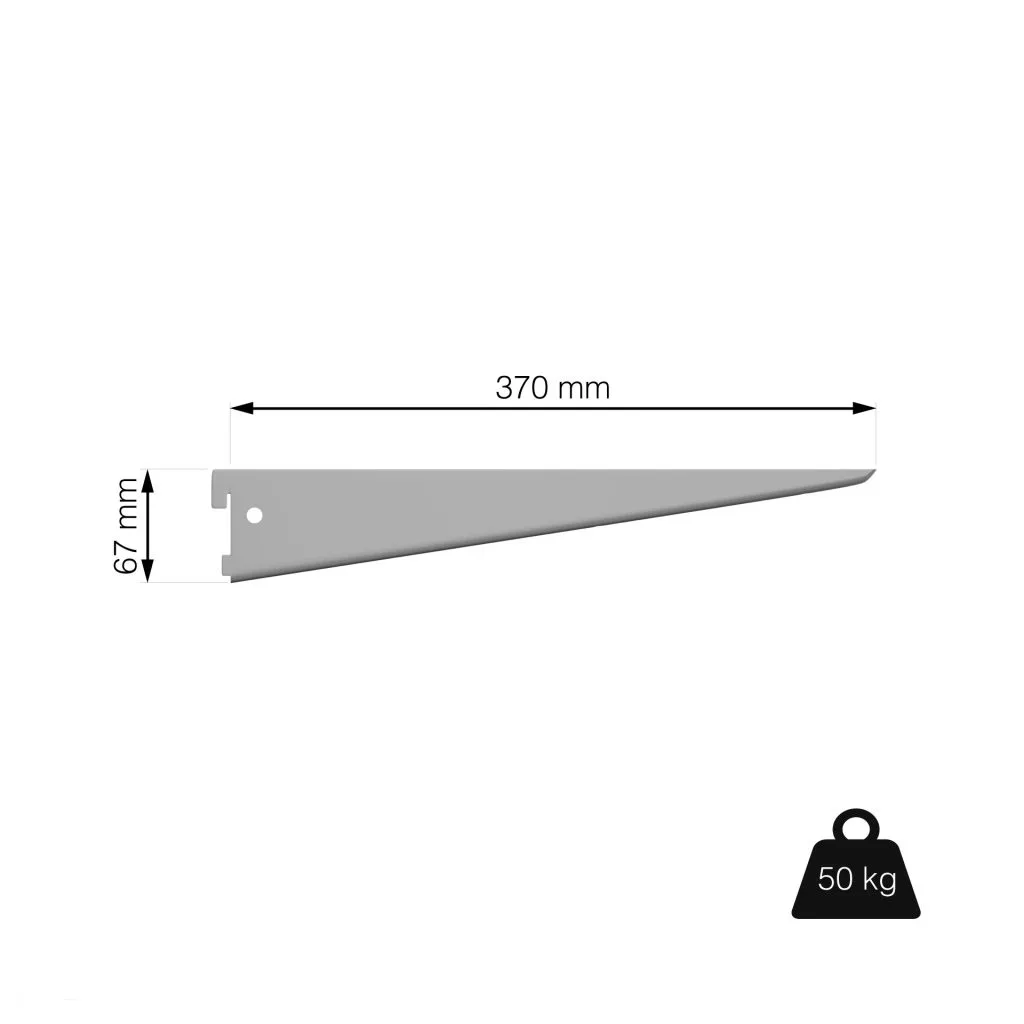 Ezüst színű fém U-tartó, 370 mm mély és 67 cm magas polcokhoz tervezve.