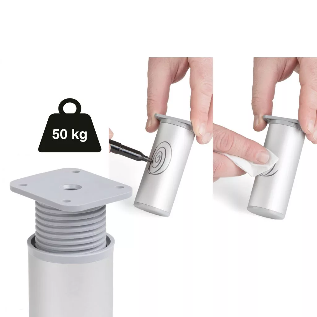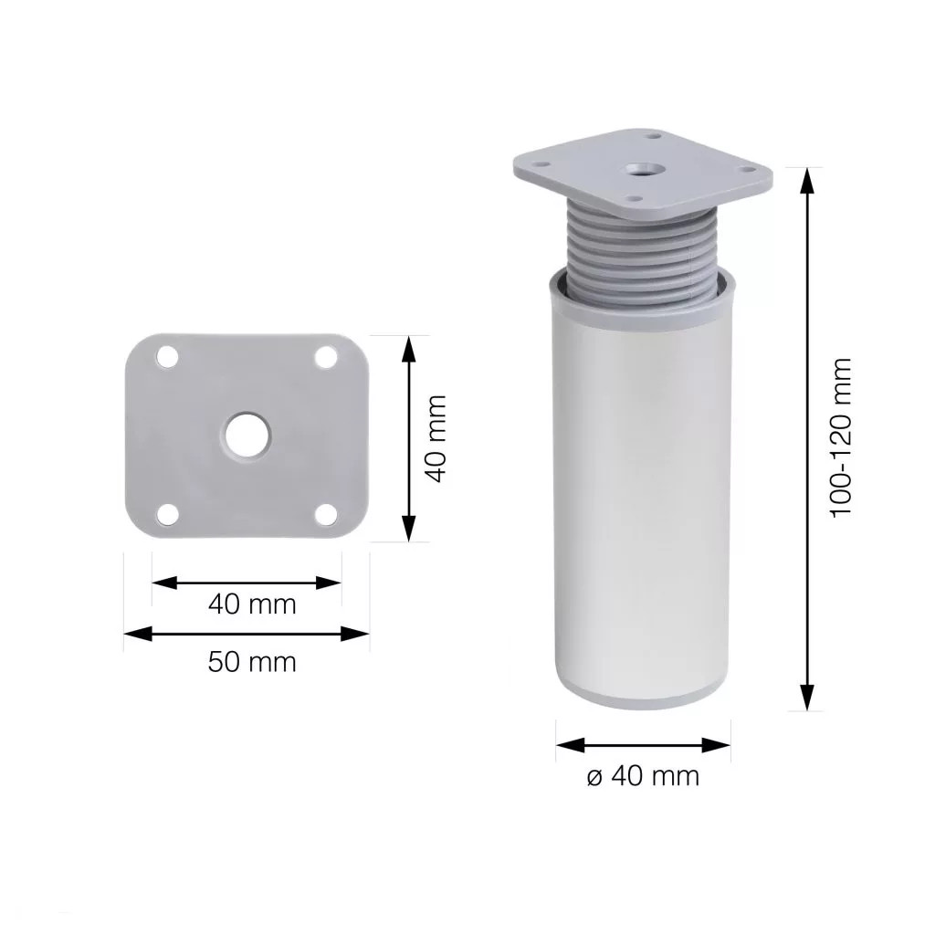 A 100-120 mm magas (akár 115 mm-es stabil magasságig) kerek, műanyag kivitelű bútorláb stílusos dizájndarabpá varázsolja bútorát. Cikkünk segít kiválasztani a magasságban állítható bútorlábakat.