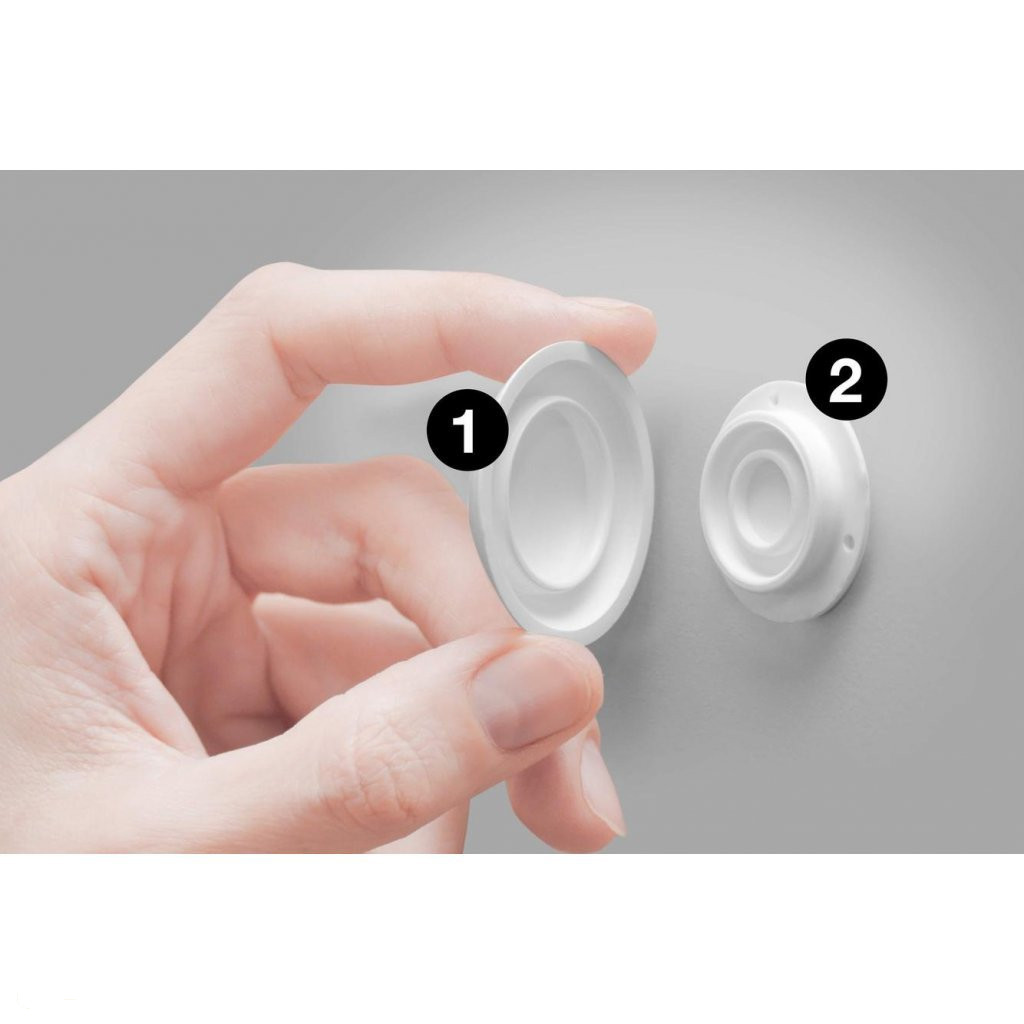 40 mm átmérőjű és 10 mm magas, fehér színű műanyag ajtóütköző. A falra a fogantyú magasságában ragasztható.