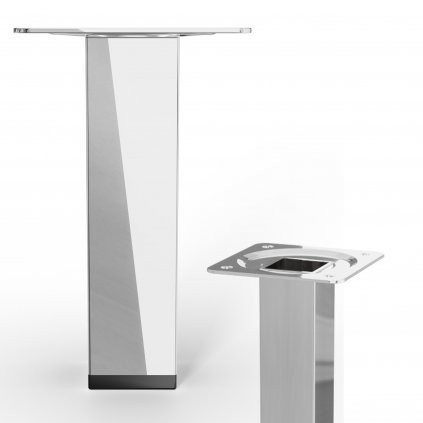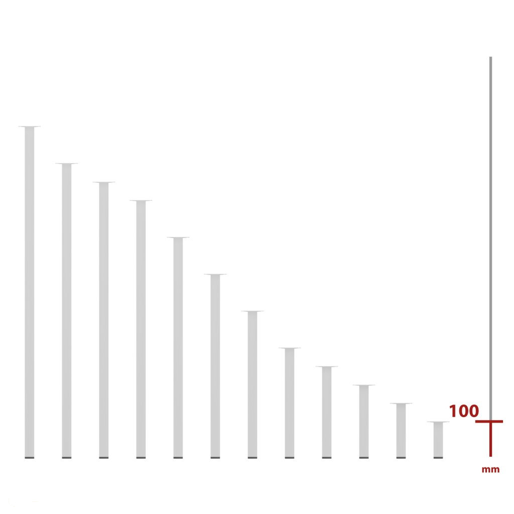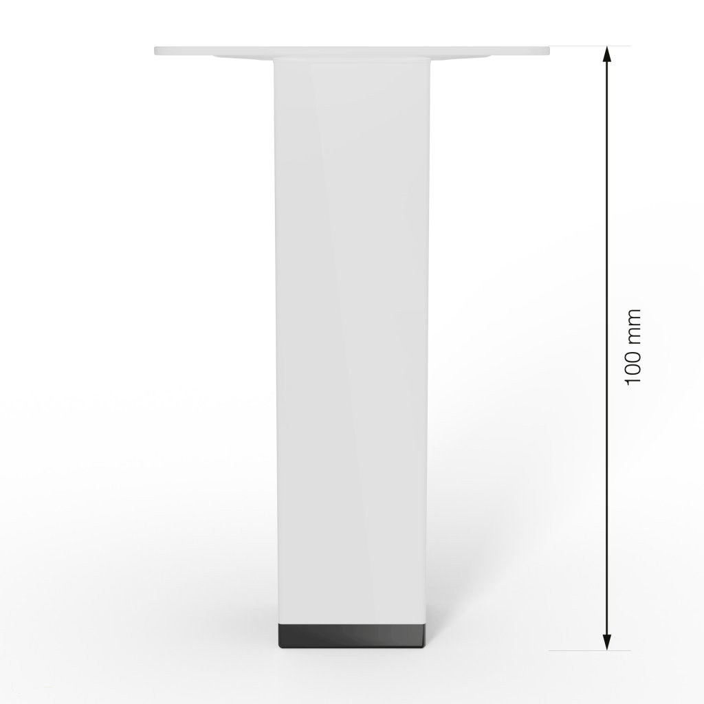 Négyzet alakú fém bútorláb fehér színben, 25x25 mm-es profillal, 100 mm magas, 60x60 mm-es lemezzel és alsó műanyag csúszótalppal.