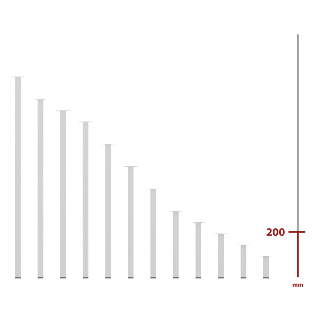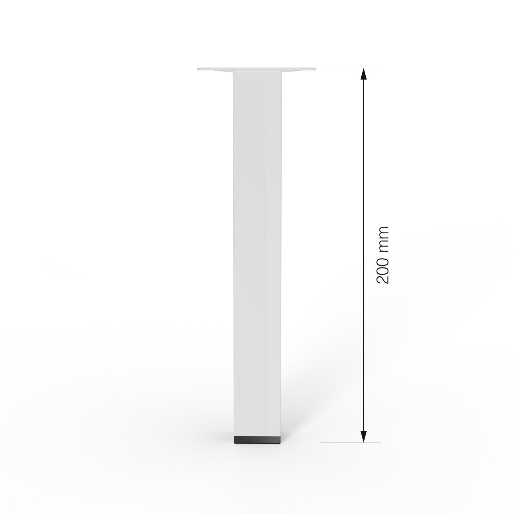 Négyzet alakú fém bútorláb fehér színben, 25x25 mm-es profillal, 200 mm magas, 60x60 mm-es lemezzel és alsó műanyag csúszótalppal.