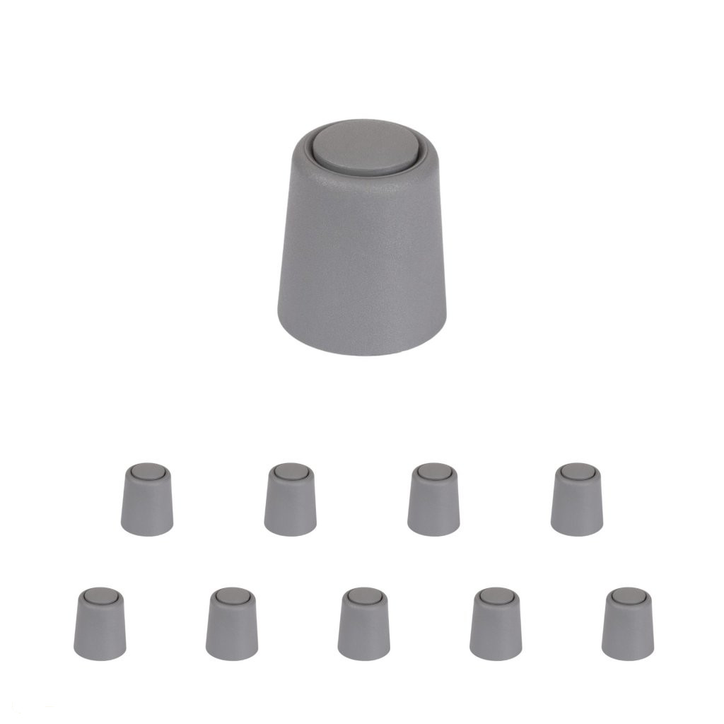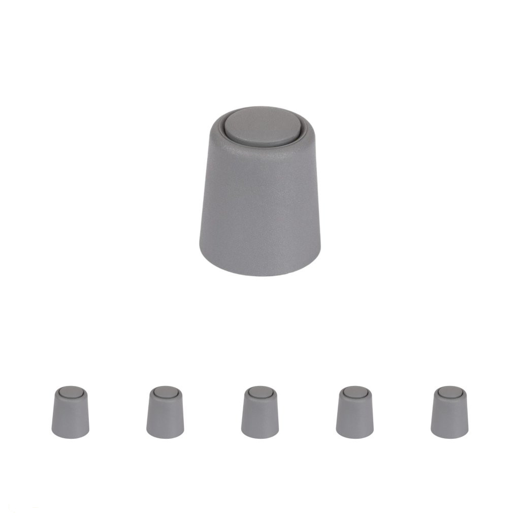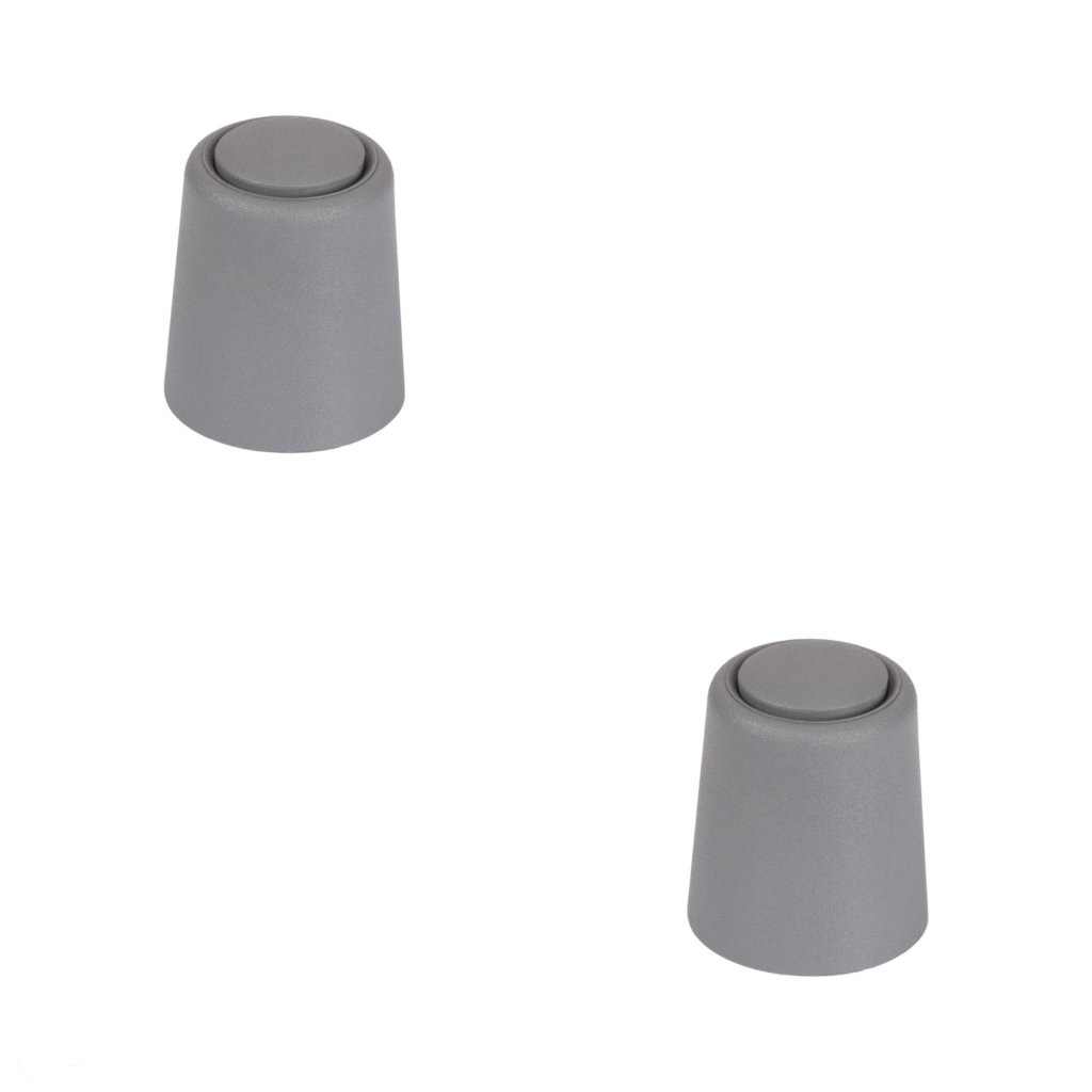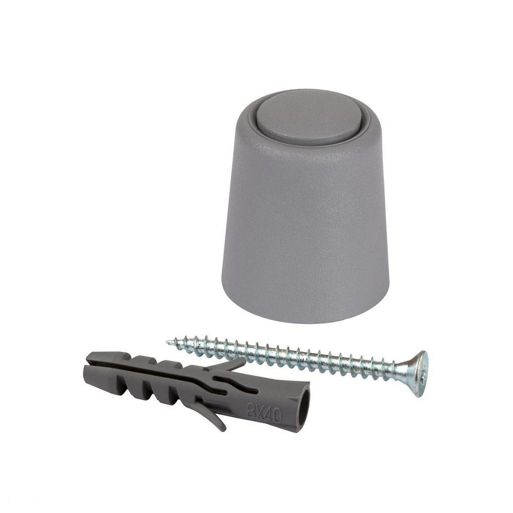 Műanyag ajtóütköző szürke kivitelben, 24 mm átmérővel és 30 mm magassággal. Védi a falakat és a bútorokat az ajtó ütődéseitől. Minden padlótípusra csavarozható. A csomag 2 ütközőt tartalmaz, rögzítőanyaggal együtt.