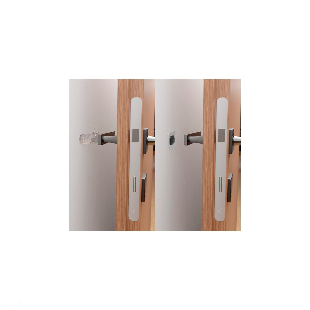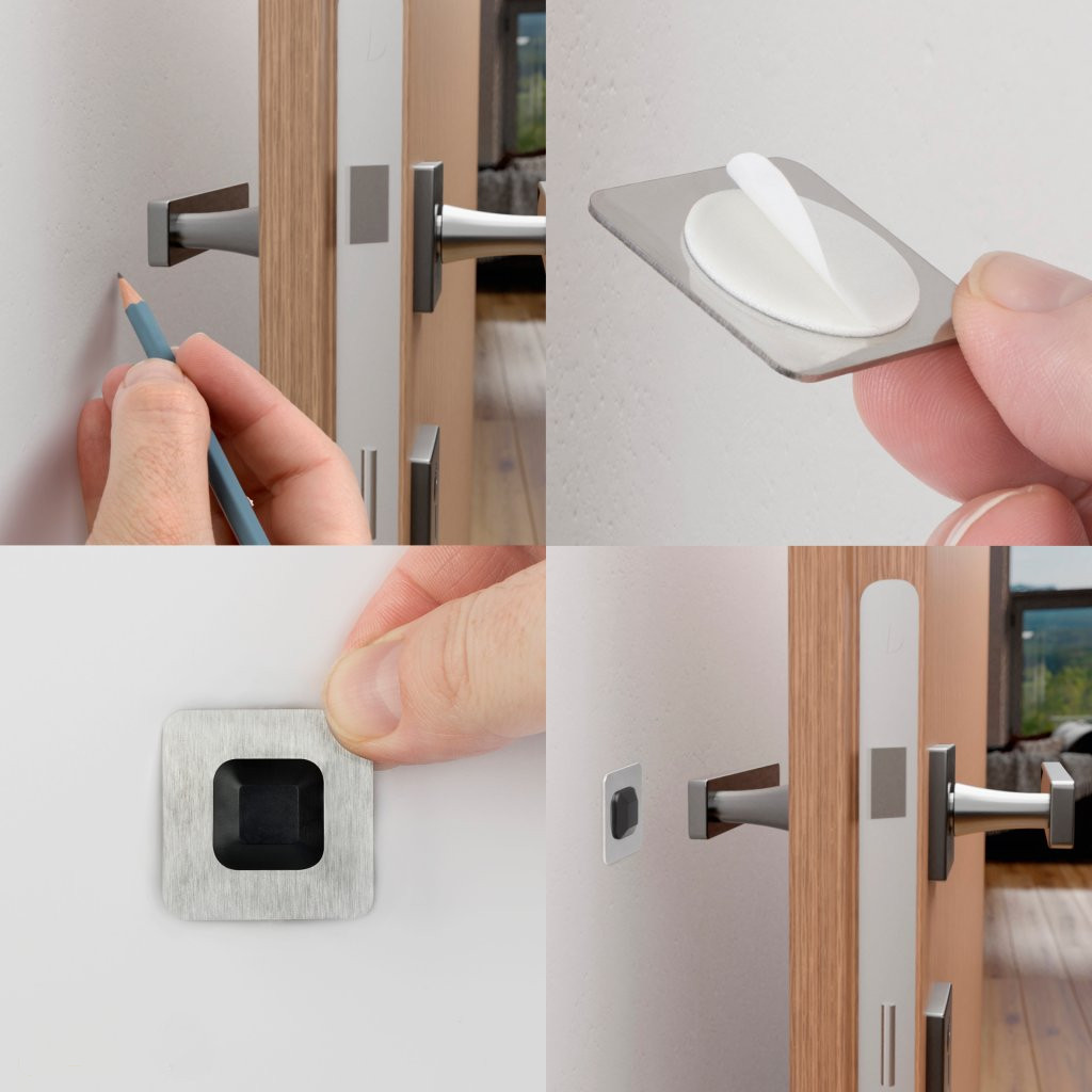 Rozsdamentes acél ajtóütköző szálcsiszolt rozsdamentes acél felülettel, 33 mm széles és 33 mm magas. Falra ragasztható a fogantyú magasságában. Védi a falat az ütésektől.