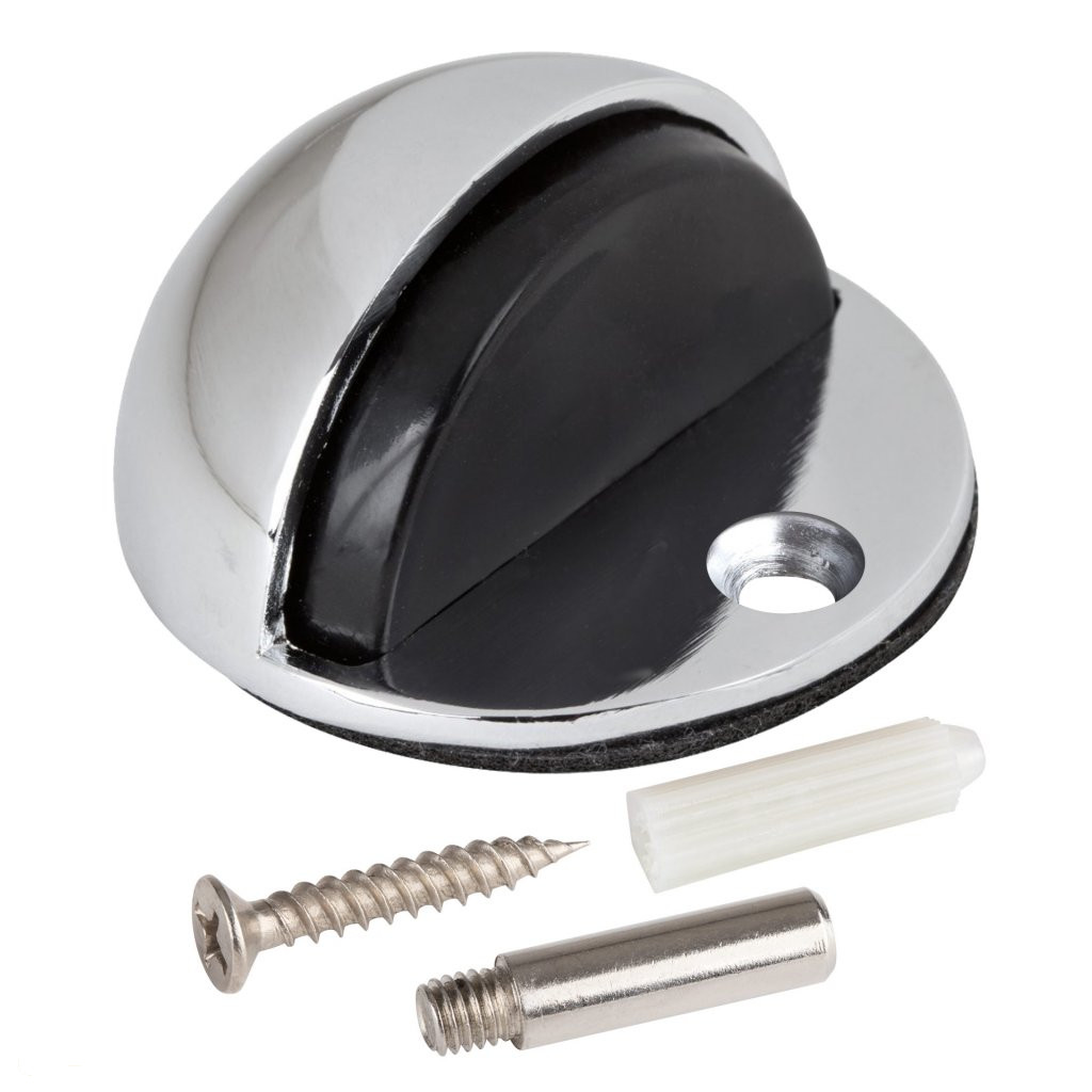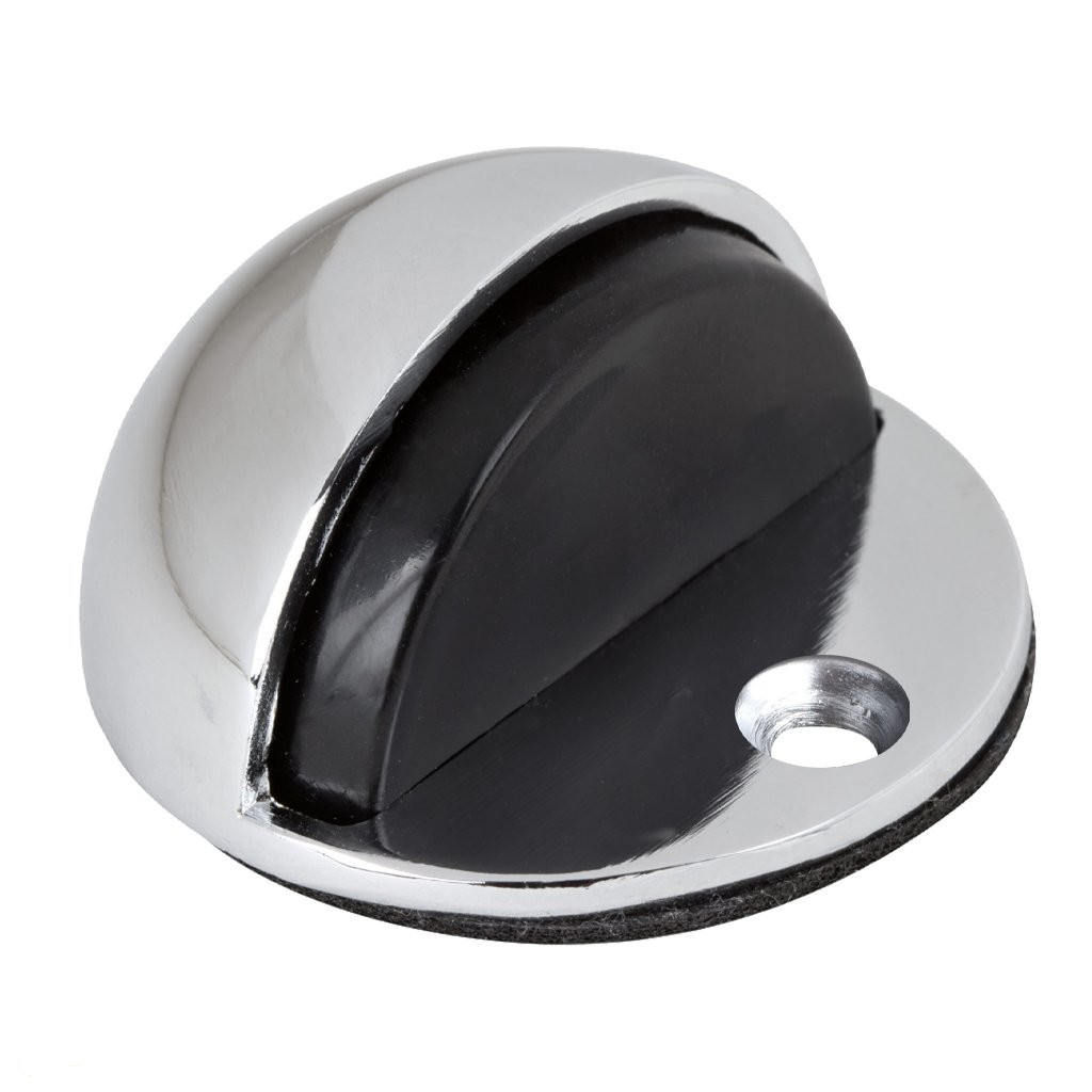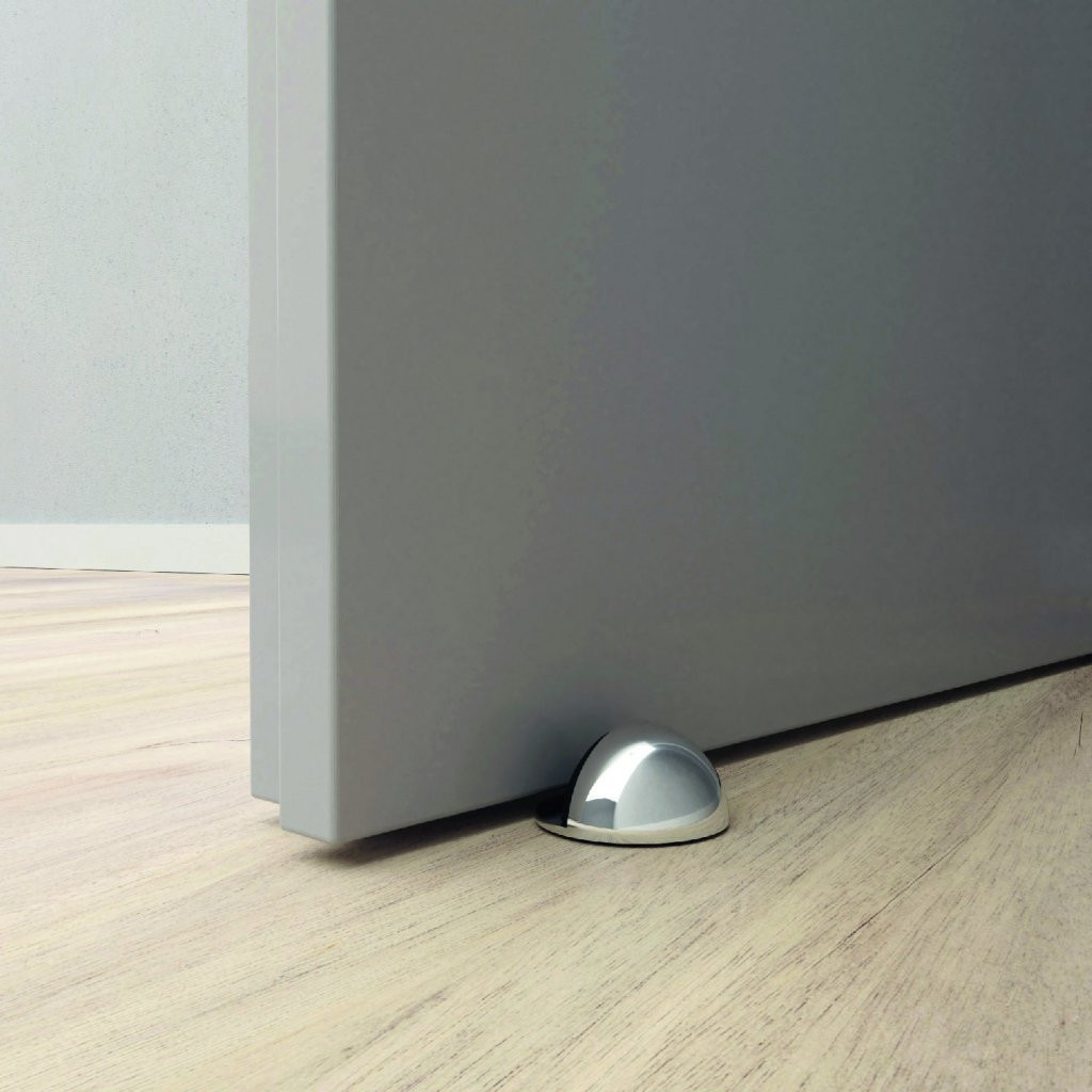 Krómozott fém ajtóütköző, 45 mm átmérővel és 25 mm magassággal. Védi a falakat és a bútorokat az ajtó ütődéseitől. Minden padlótípusra csavarozható. Rögzítőanyaggal együtt.