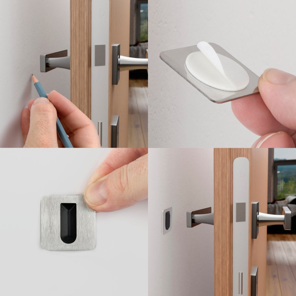 Rozsdamentes acél ajtóütköző szálcsiszolt rozsdamentes acél felülettel, 30 mm széles és 30 mm magas. Falra ragasztható a kilincs magasságában. Védi a falat az ütésektől.
