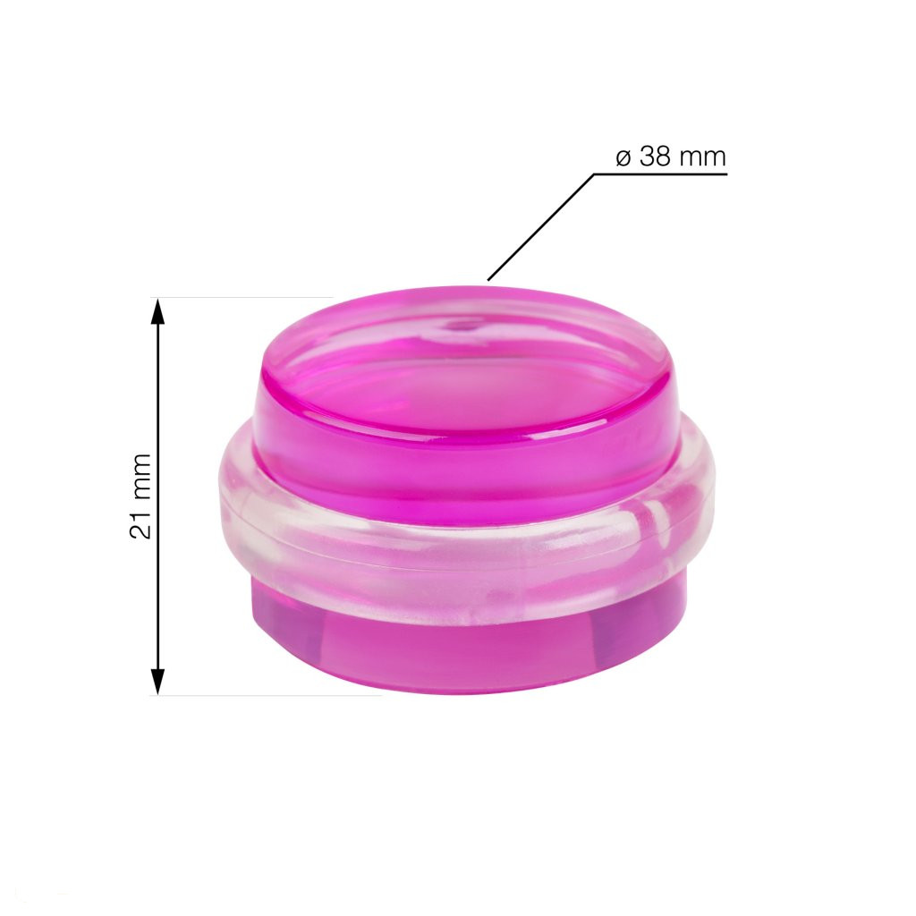 Rózsaszín ajtóütköző átlátszó hüvellyel, 38 mm átmérőjű és 21 mm magas. Védi a falakat és a bútorokat az ajtó ütődéseitől. Minden típusú sima padlóra ragasztható.