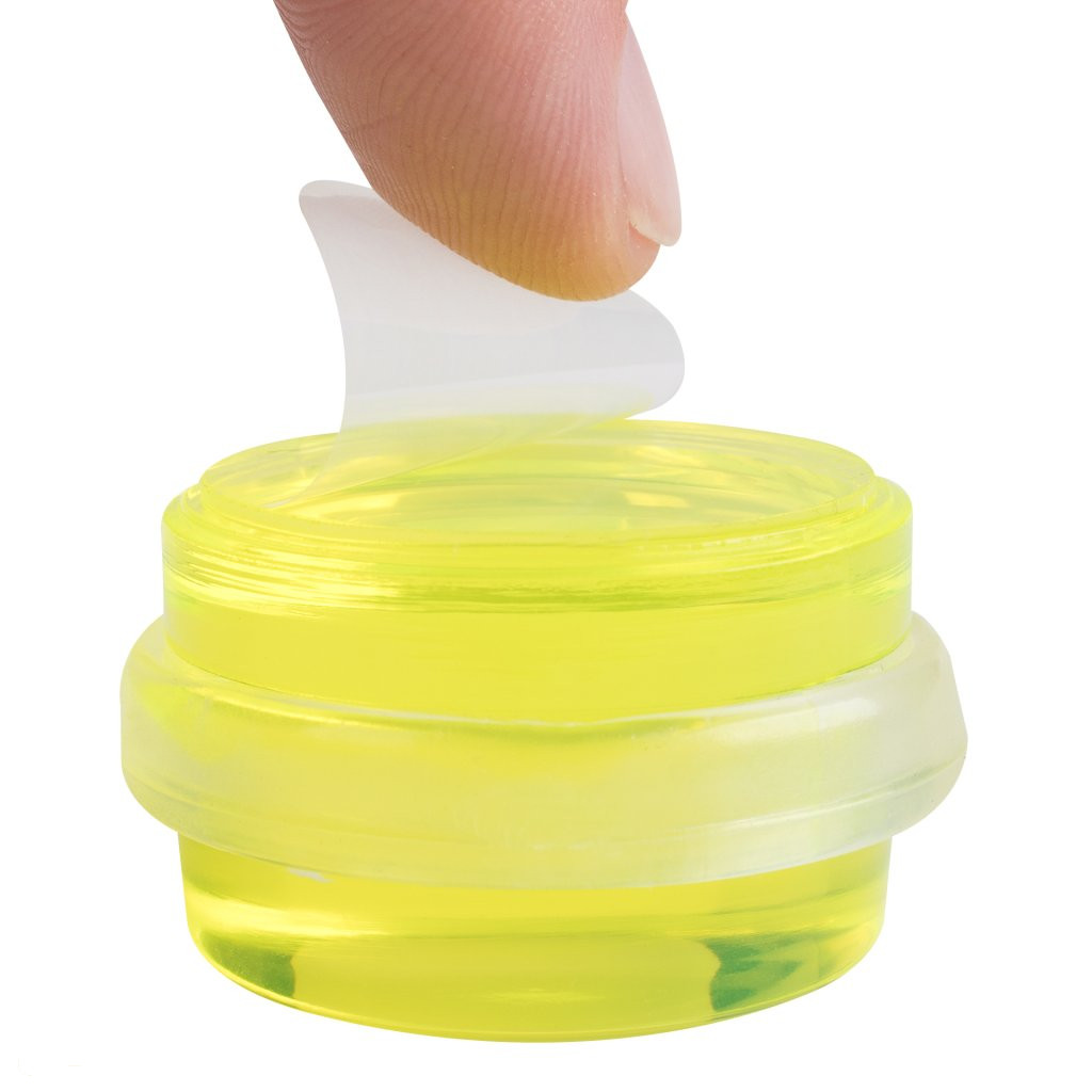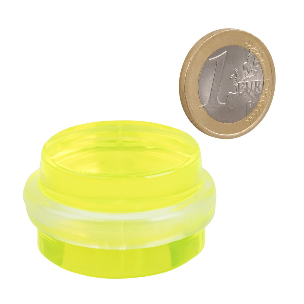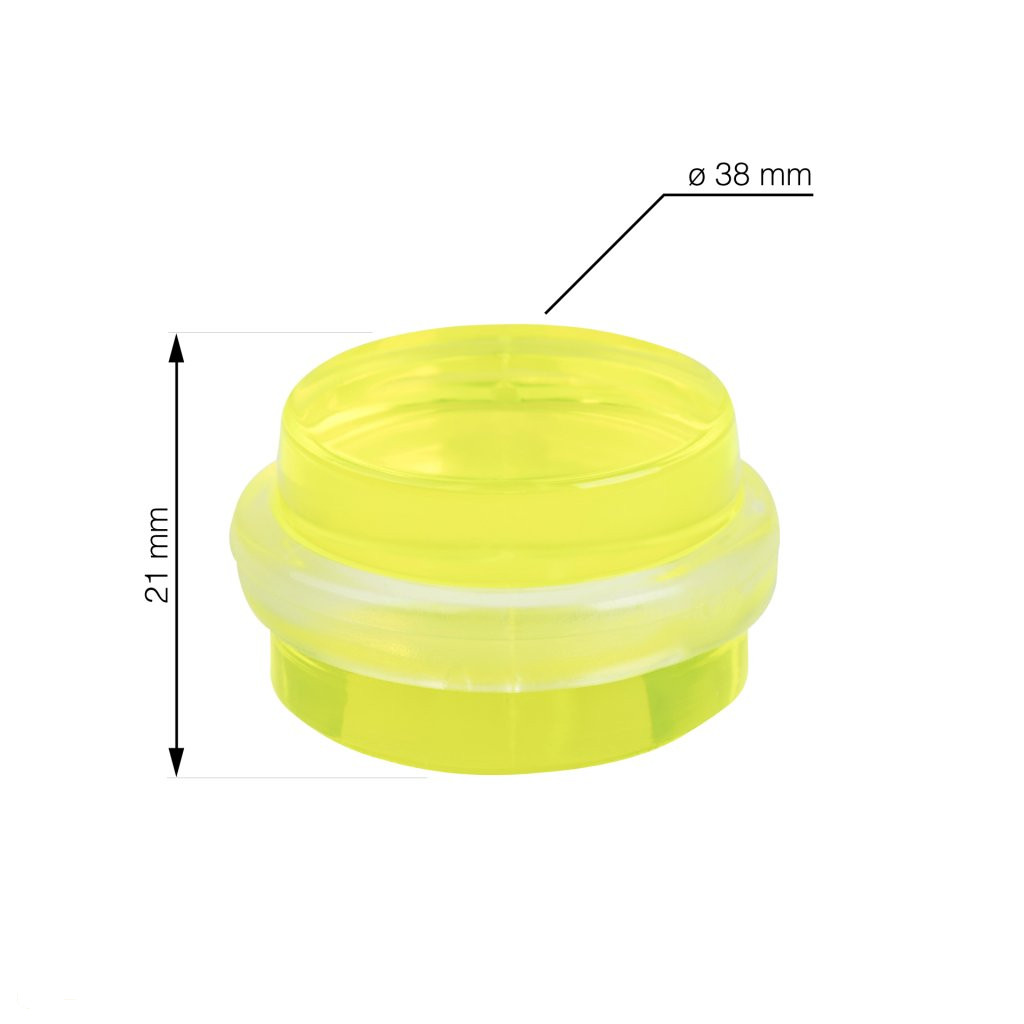 Sárga ajtóütköző átlátszó hüvellyel, 38 mm átmérőjű és 21 mm magas. Védi a falakat és a bútorokat az ajtó ütődéseitől. Minden típusú sima padlóra ragasztható.