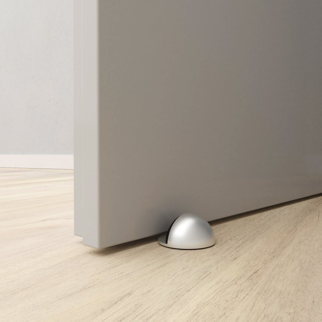 Matt krómozott fém ajtóütköző, 44 mm átmérővel és 25 mm magassággal. Védi a falakat és a bútorokat az ajtó ütődéseitől. Minden sima padlótípusra ragasztható.