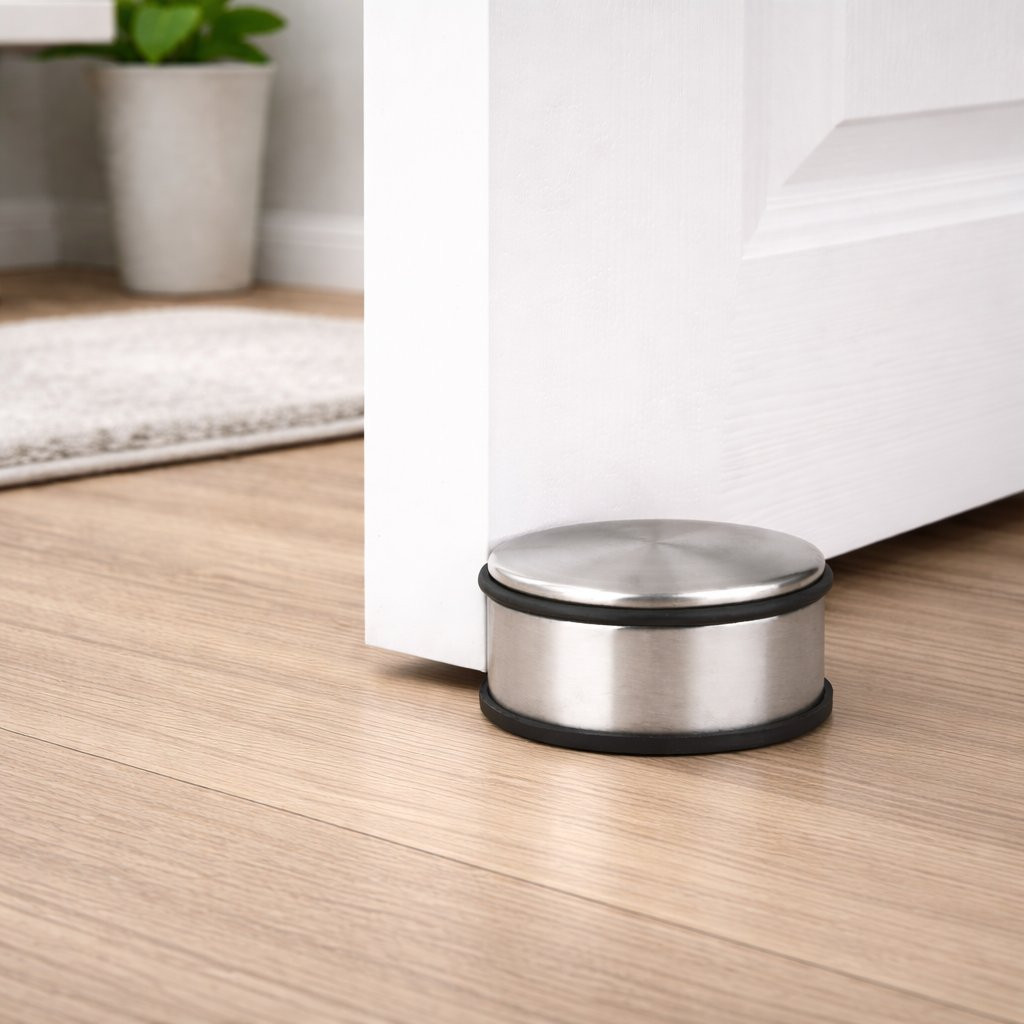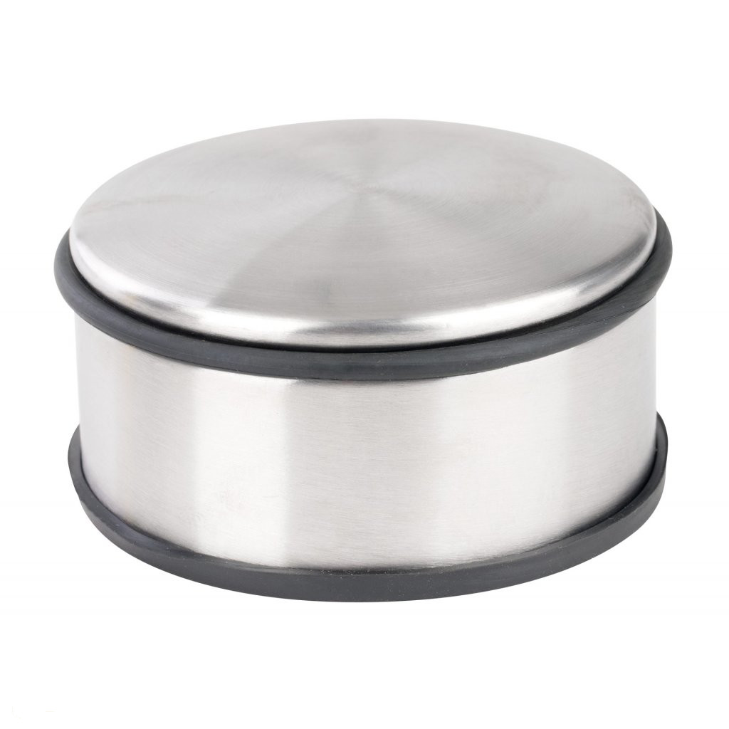 Masszív, szabadon álló ajtóütköző rozsdamentes acél kivitelben, 110 mm átmérővel és 60 mm szélességgel, súlya 1,1 kg (gumihüvellyel együtt). Védi a falakat és a bútorokat az ajtó ütődéseitől.