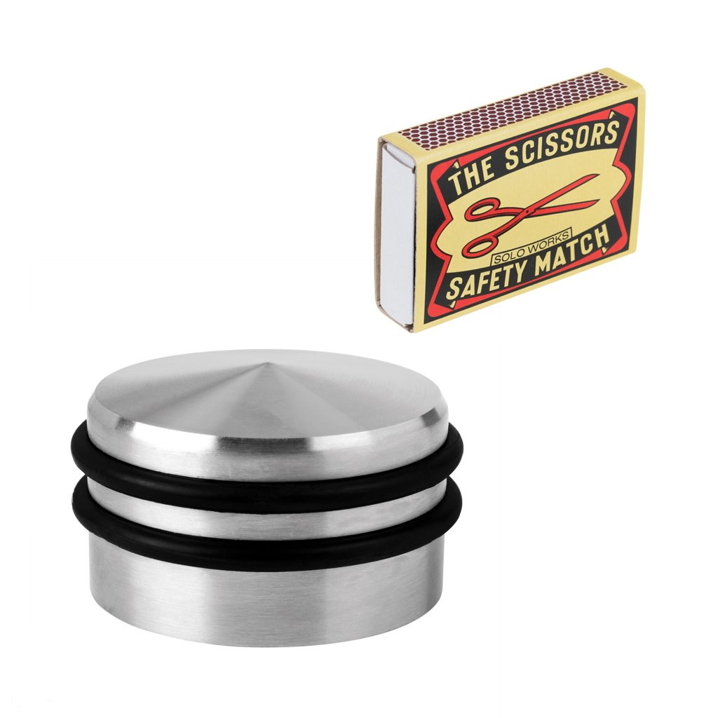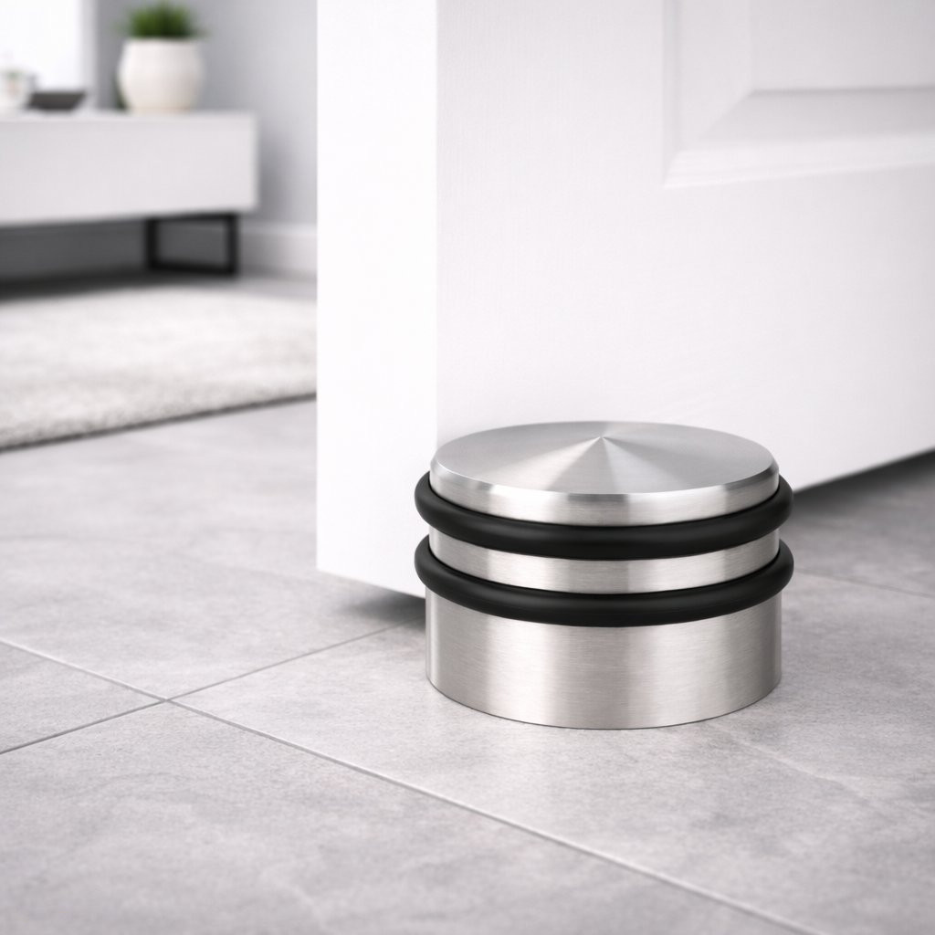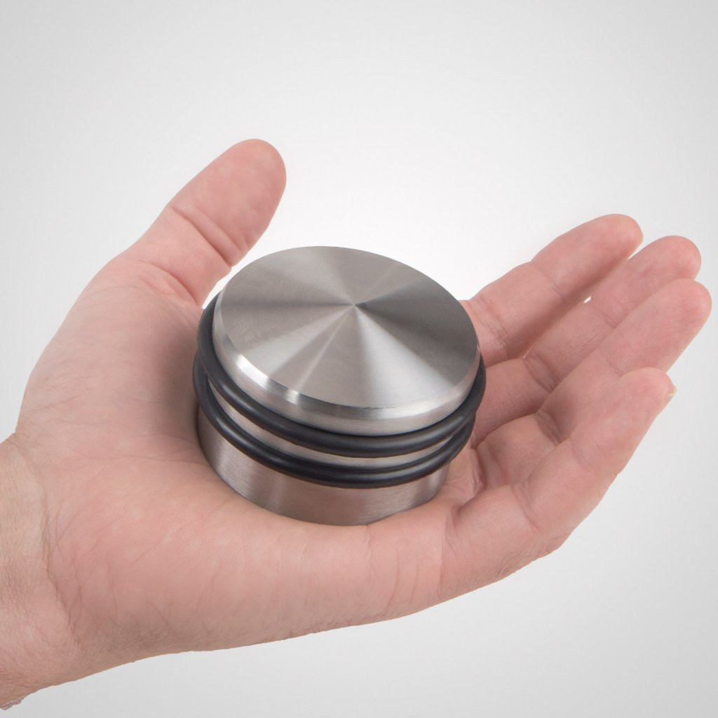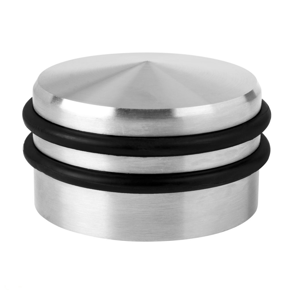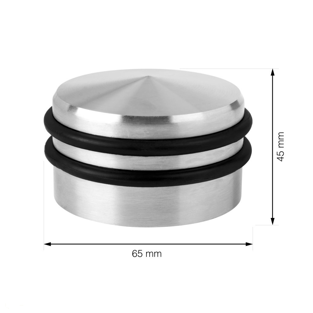 Szabadon álló ajtóütköző szálcsiszolt rozsdamentes acél kivitelben, 65 mm átmérővel és 45 mm szélességgel, súlya 0,7 kg (gumihüvellyel együtt). Védi a falakat és a bútorokat az ajtó ütődéseitől.