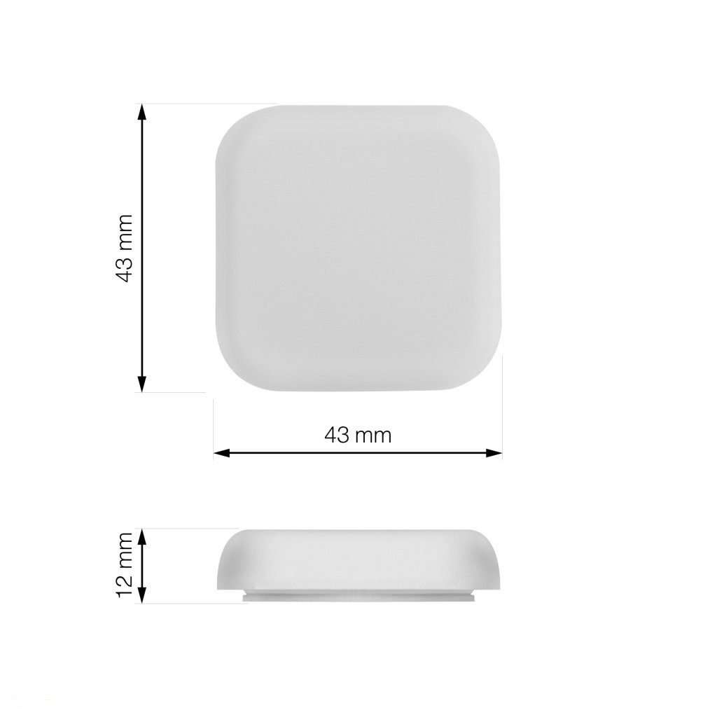Fehér színű műanyag ajtóütköző, 43 mm széles és 43 mm magas. Alkalmas falra ragasztásra, a fogantyú magasságában.