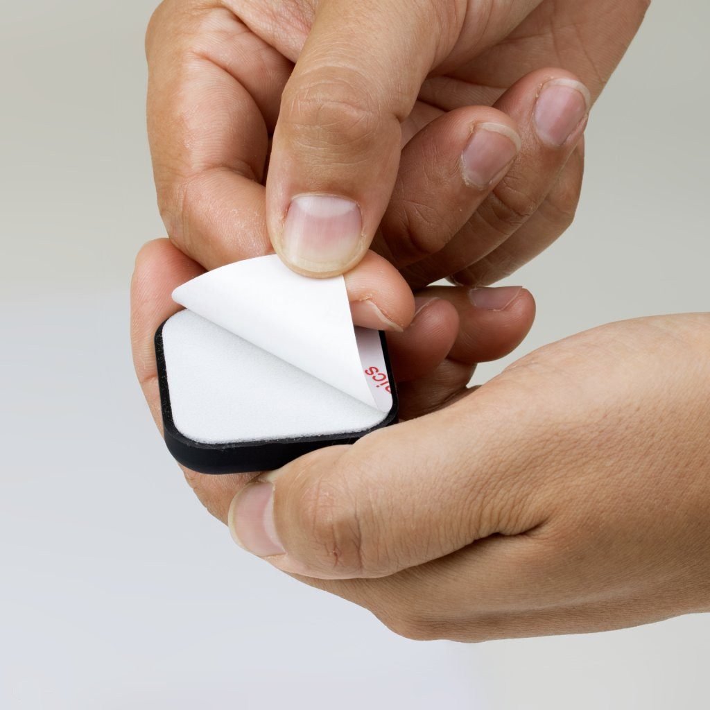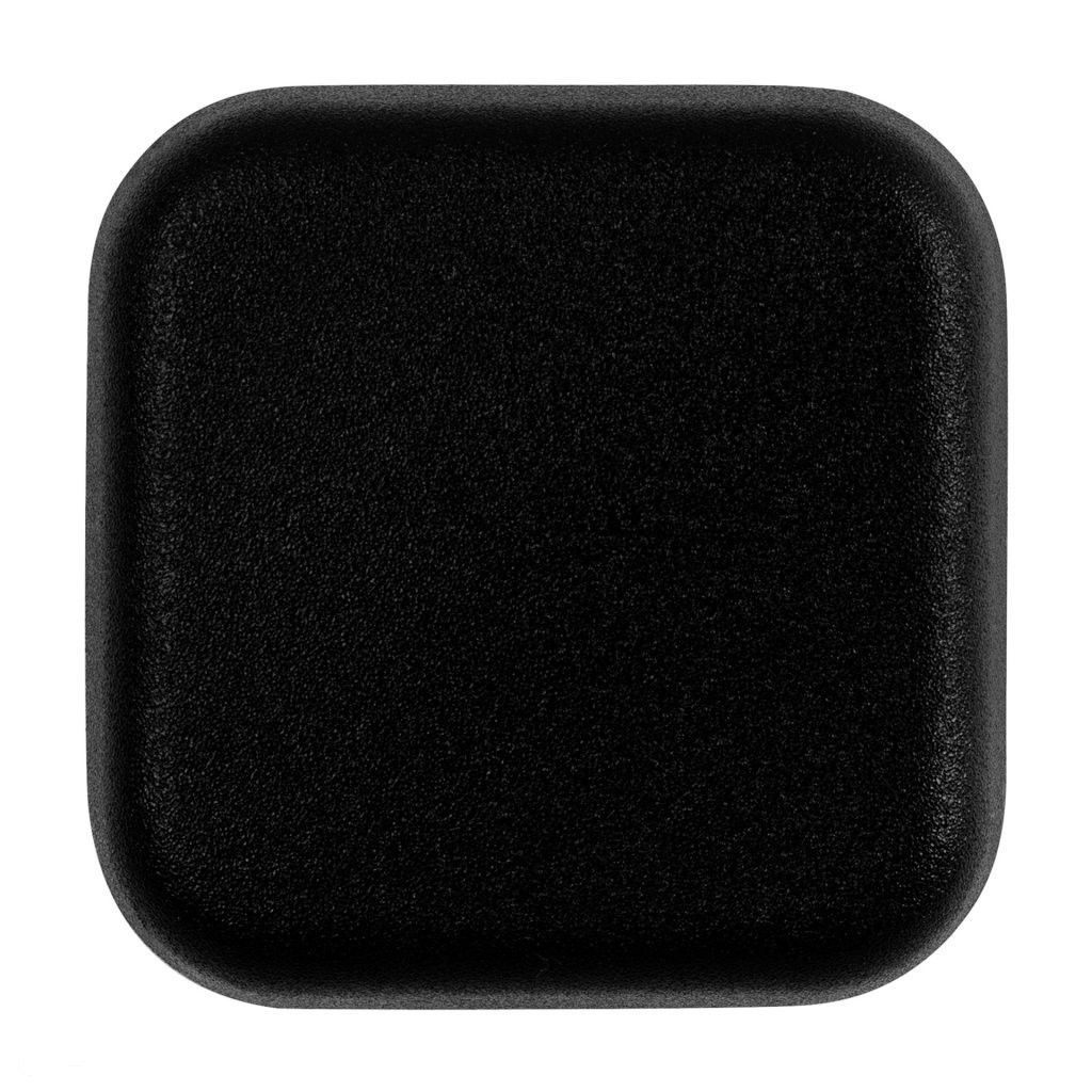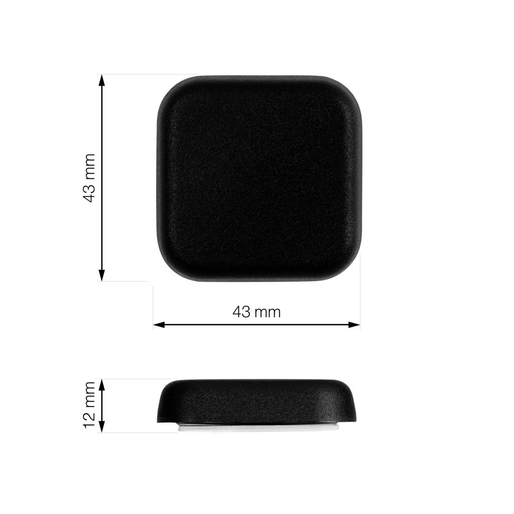 Műanyag ajtóütköző fekete színben, 43 mm széles és 43 mm magas. Alkalmas falra ragasztásra, a fogantyú magasságában.