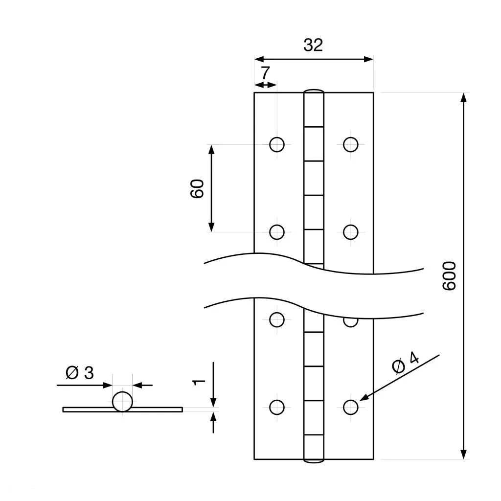 Nikkelezett zongorapánt, 32 mm széles és 600 mm hosszú, csavarozáshoz alkalmas