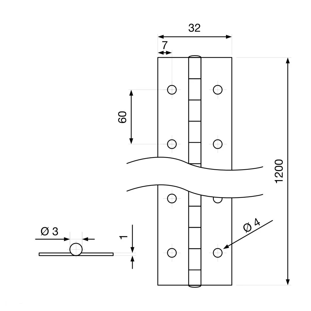 Nikkelezett zongorapánt, 32 mm széles és 1200 mm hosszú, csavarozáshoz alkalmas