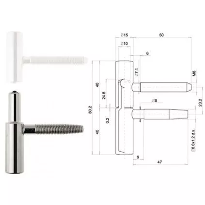 A zsanér alsó része fehér horganyzott felületkezeléssel, 40 mm-es csavarhosszal és M8-as menettel az ajtólaphoz.