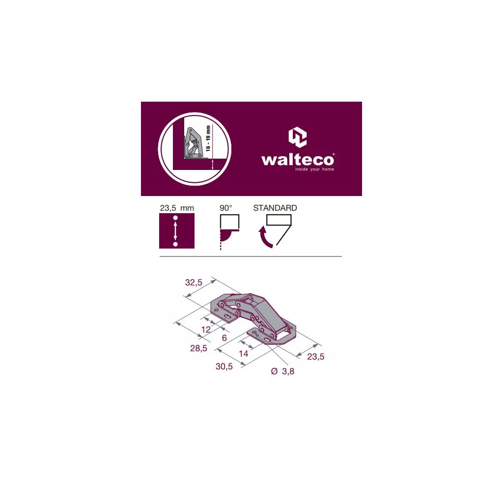 Mini zsanér 90°-os nyitási szöggel, 23,5 mm-es rasztertávolsággal és automatikus záródással. 16-19 mm vastagságú ajtókhoz alkalmas. Könnyű és gyors szerelés - csavarozással.
