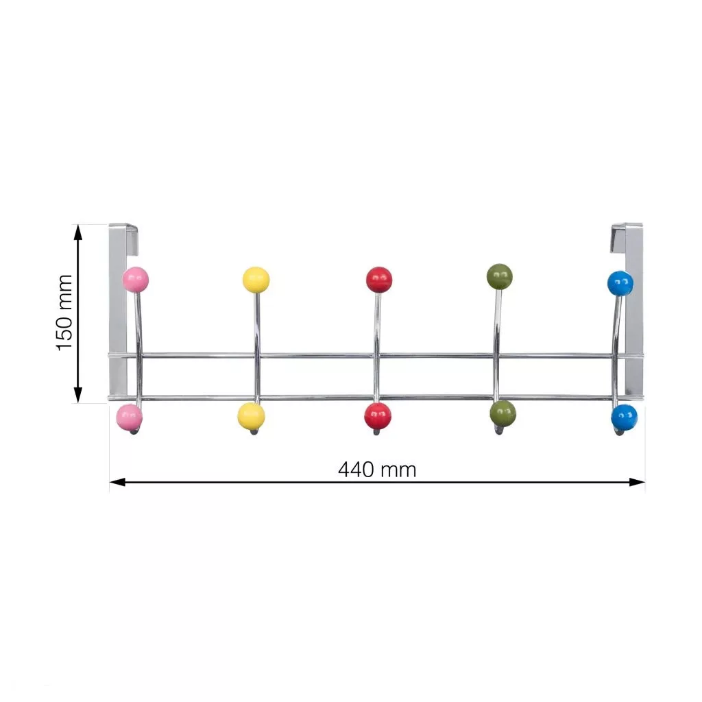 Ajtóakasztó 5 db krómozott kampóval (színes golyókkal díszítve), szélessége 440 mm, magassága 150 mm és mélysége 105 mm. Akasztómélység 40 mm.