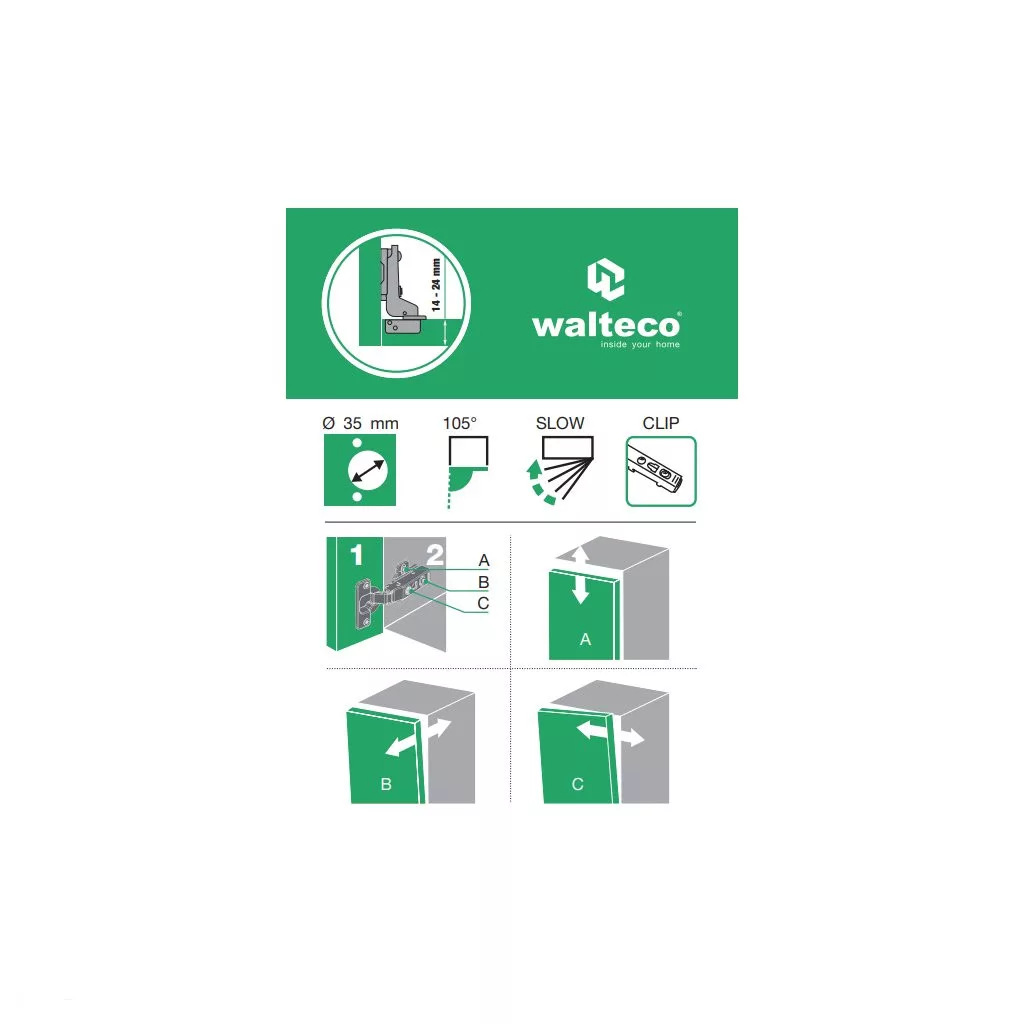 35 mm átmérőjű csésze alakú zsanér, klipszes rögzítéssel és integrált csillapítással, közététes ajtótípushoz.
