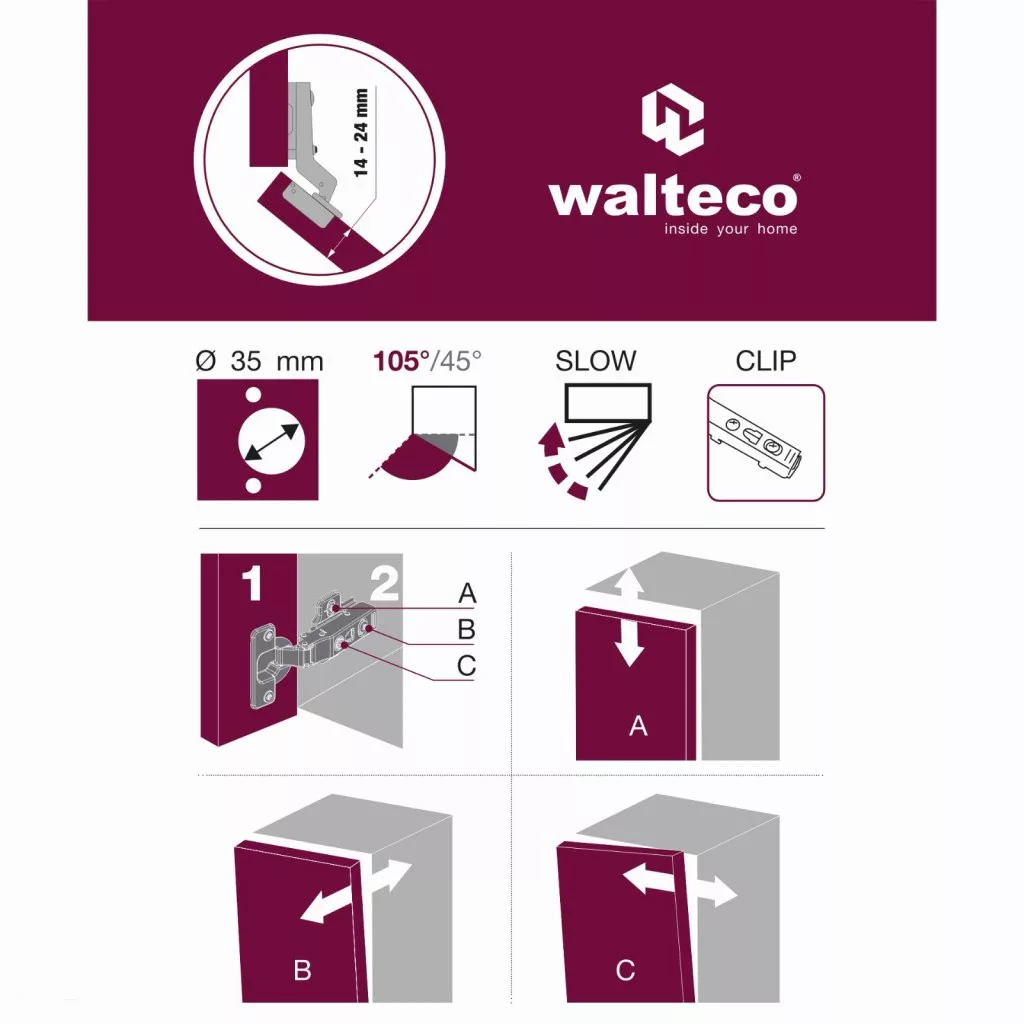 Csésze alakú zsanér 35 mm átmérőjű 45°-os rögzítőelemes beépített csillapítással